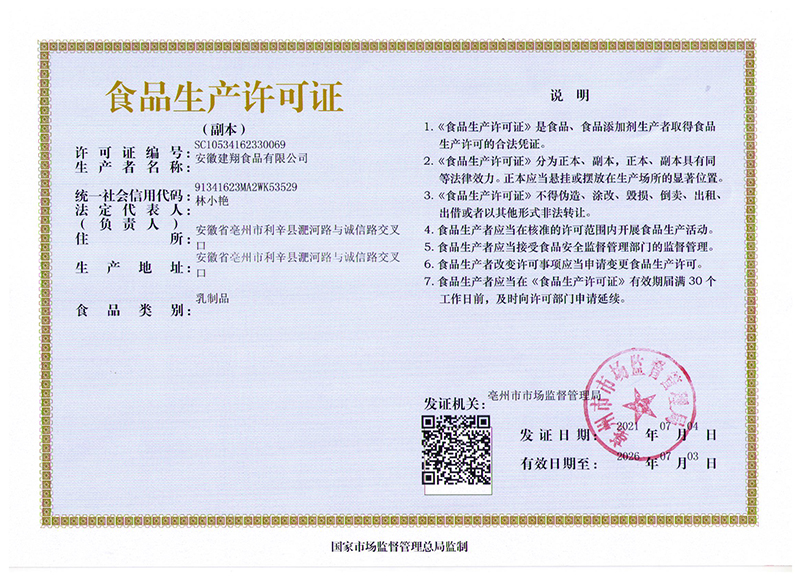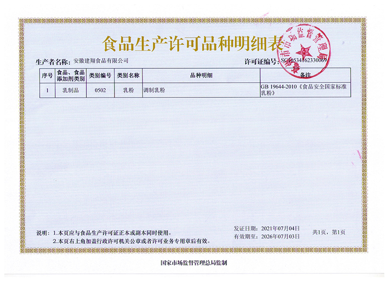 建翔食品開發(fā)出多款“好功能、多樣化、精準(zhǔn)細(xì)分”的健康營養(yǎng)食品配方,通過對產(chǎn)品配方、工藝設(shè)計,質(zhì)量把控方面的層層審核,最終獲批調(diào)制乳粉(按國標(biāo)GB 19644-2010統(tǒng)稱為乳粉)的生產(chǎn)許可,乳粉的生產(chǎn)許可審查方案非常嚴(yán)格,經(jīng)過層層嚴(yán)格的審查,無論從企業(yè)的生產(chǎn)條件、生產(chǎn)環(huán)境、產(chǎn)品管控能力、設(shè)備布局與工藝流程完善性、乃至對整個生產(chǎn)的過程,例如原輔料采購評審和現(xiàn)場核查、配方研究、工藝研究、產(chǎn)品穩(wěn)定性研究、生產(chǎn)清潔驗證、生產(chǎn)過程控制及批批出廠檢驗等產(chǎn)品全產(chǎn)業(yè)鏈進(jìn)行嚴(yán)格的評審。