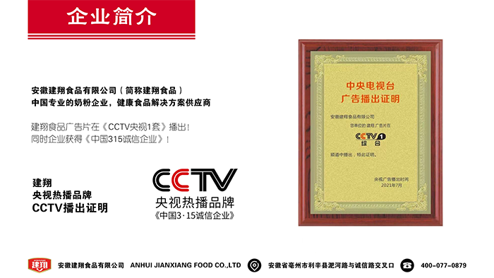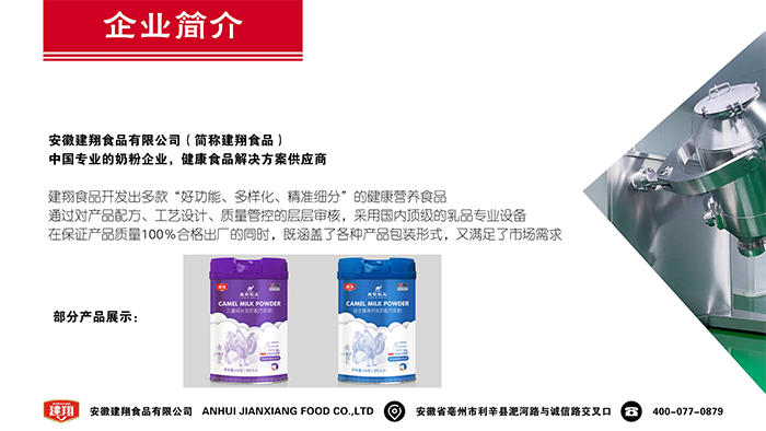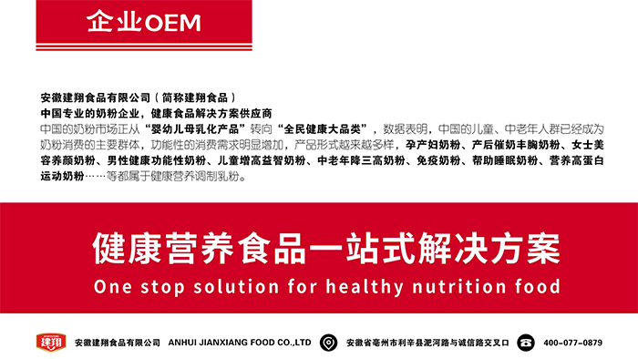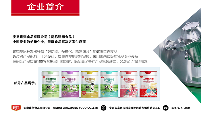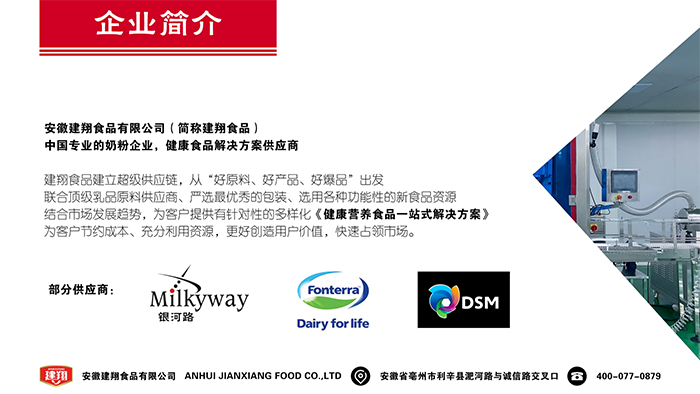 安徽建翔食品有限公司(簡稱建翔食品)成立于2003年,企業(yè)在2020年被安徽省重點招商引資的乳制品專業(yè)企業(yè),是安徽省唯一一家調(diào)制乳粉工廠,也是國內(nèi)專業(yè)健康食品解決方案供應(yīng)商,集調(diào)制奶粉、特色乳制品、營養(yǎng)保健品、功能性營養(yǎng)品等研發(fā)、生產(chǎn)、銷售于一體。