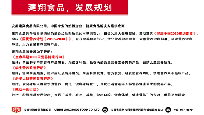 安徽健翔食品有限公司最終通過自身強(qiáng)大的生產(chǎn)實力、過硬的軟件設(shè)施和嚴(yán)謹(jǐn)質(zhì)檢能力,順利通過了安徽省市場監(jiān)督管理局的專家組考核,獲準(zhǔn)生產(chǎn)乳粉。意味著建翔食品在未來將給大家?guī)碓絹碓蕉噌槍Σ煌啦煌蛻粜卸行У慕】禒I養(yǎng)解決方案。