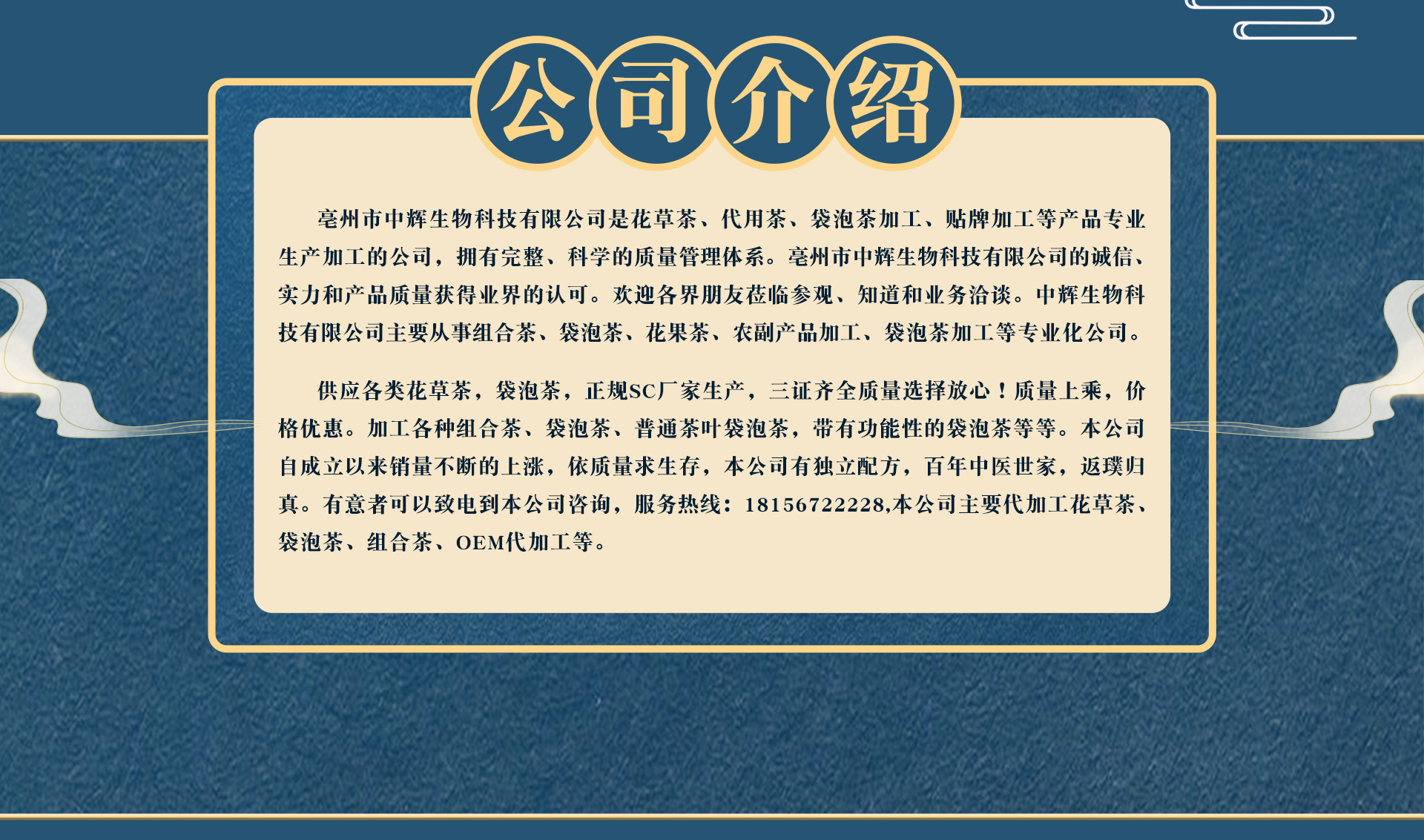亳州市中輝生物科技有限公司產(chǎn)業(yè)五大優(yōu)勢(shì): (1)直接與原產(chǎn)地合作。 (2)原材料供應(yīng)量穩(wěn)定。 (3)成品可以依據(jù)要求特定加工 (4)產(chǎn)品豐富,定位合理——美容、補(bǔ)腎、睡眼、電腦茶等適合男女老少不同類(lèi)型的人群,市場(chǎng)覆蓋面廣泛,需求量大。 (5)包裝精致、設(shè)計(jì)新穎-----全新、獨(dú)特的系列性設(shè)計(jì),包裝搶眼,消費(fèi)者入心 公司還可以為你提供各類(lèi)特色的花茶代加工服務(wù)。OEM代加工早。貼牌生產(chǎn)外包,可為您帶來(lái)可觀的經(jīng)濟(jì)效益,省去了辦手續(xù)、租地辦車(chē)間、購(gòu)買(mǎi)生產(chǎn)機(jī)器、雇請(qǐng)工人等許多繁雜程序,降低風(fēng)險(xiǎn),省去許多不必要的費(fèi)用。你只需一個(gè)產(chǎn)品的創(chuàng)意,其它的交給我們來(lái)做!公司秉承根據(jù)客戶(hù)需求為宗旨的服務(wù), 中輝生物科技偕全體員工歡迎