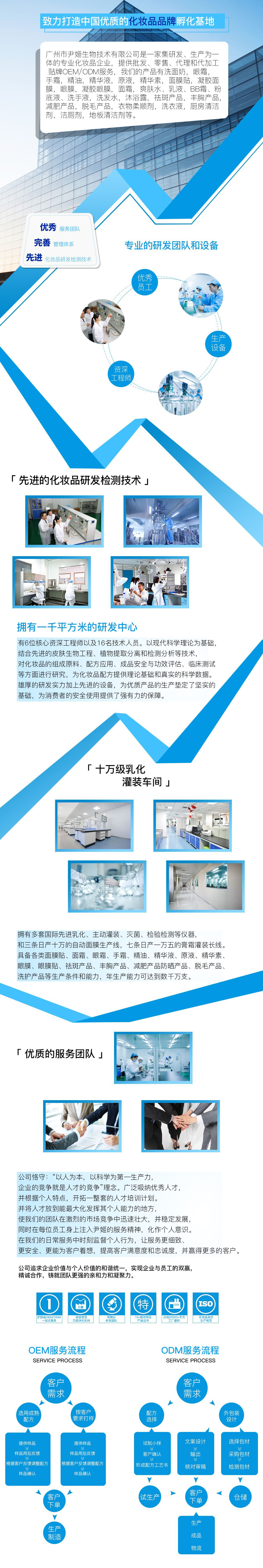 廣州市素顏生物科技有限公司是一家集研發、生產為一體的專業化妝品企業,提供批發、零售、代理和代加工 貼牌OEM/ODM服務,我們的產品有洗面奶,眼霜,手霜,精油,精華液,原液,精華素,面膜貼,凝膠面膜,眼膜,凝膠眼膜,面霜,爽膚水、乳液、BB霜、粉底液、洗手液,洗發水,沐浴露,祛斑產品,豐胸產品,減肥產品,脫毛產品,衣物柔順劑,洗衣液,廚房清潔劑,潔廁劑,地板清潔劑等。 公司廠區環境優美,生產車間環境完全按照GMPC認證所需要的條件建設,并通過“IS09001-2008” 質量認證和“GMPC”認證。目前擁有多條現代化的生產線,多臺/套國際、國內先進乳化、自動灌裝、滅菌、檢驗檢測等儀器,具備各類膏霜、洗護、美容化妝產品的生產條件和能力,年生產能力可達到數千萬支,同時工廠不僅能生產各種形態、規格、品種的化妝品,還能實現化妝品所有常規檢驗項目的檢測,全方位保證企業的產品在消費者手中的安全使用,