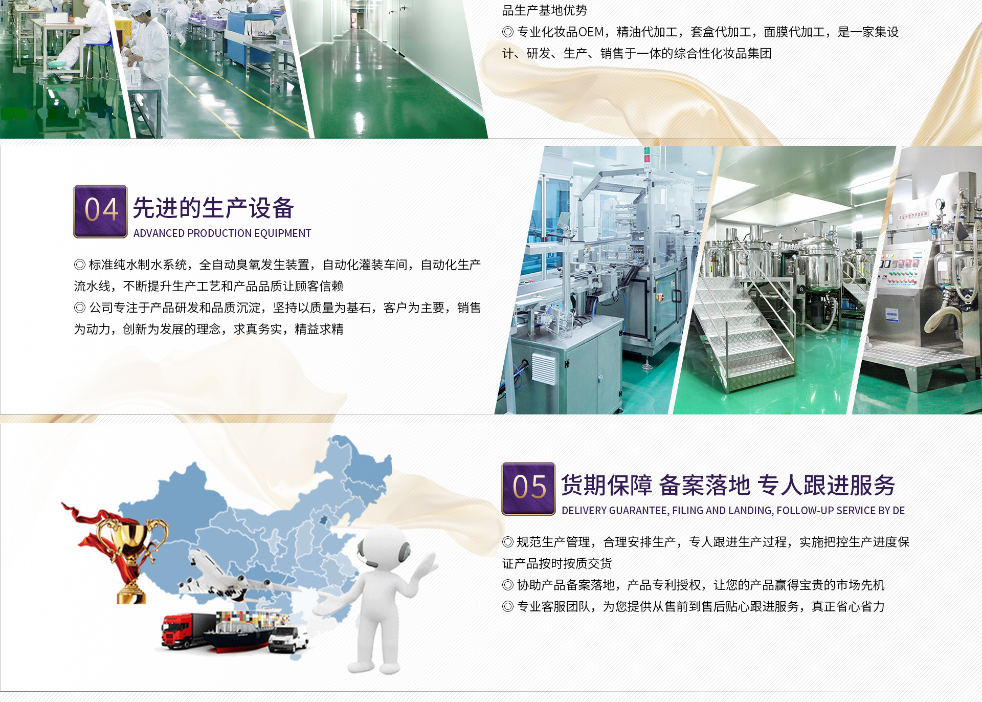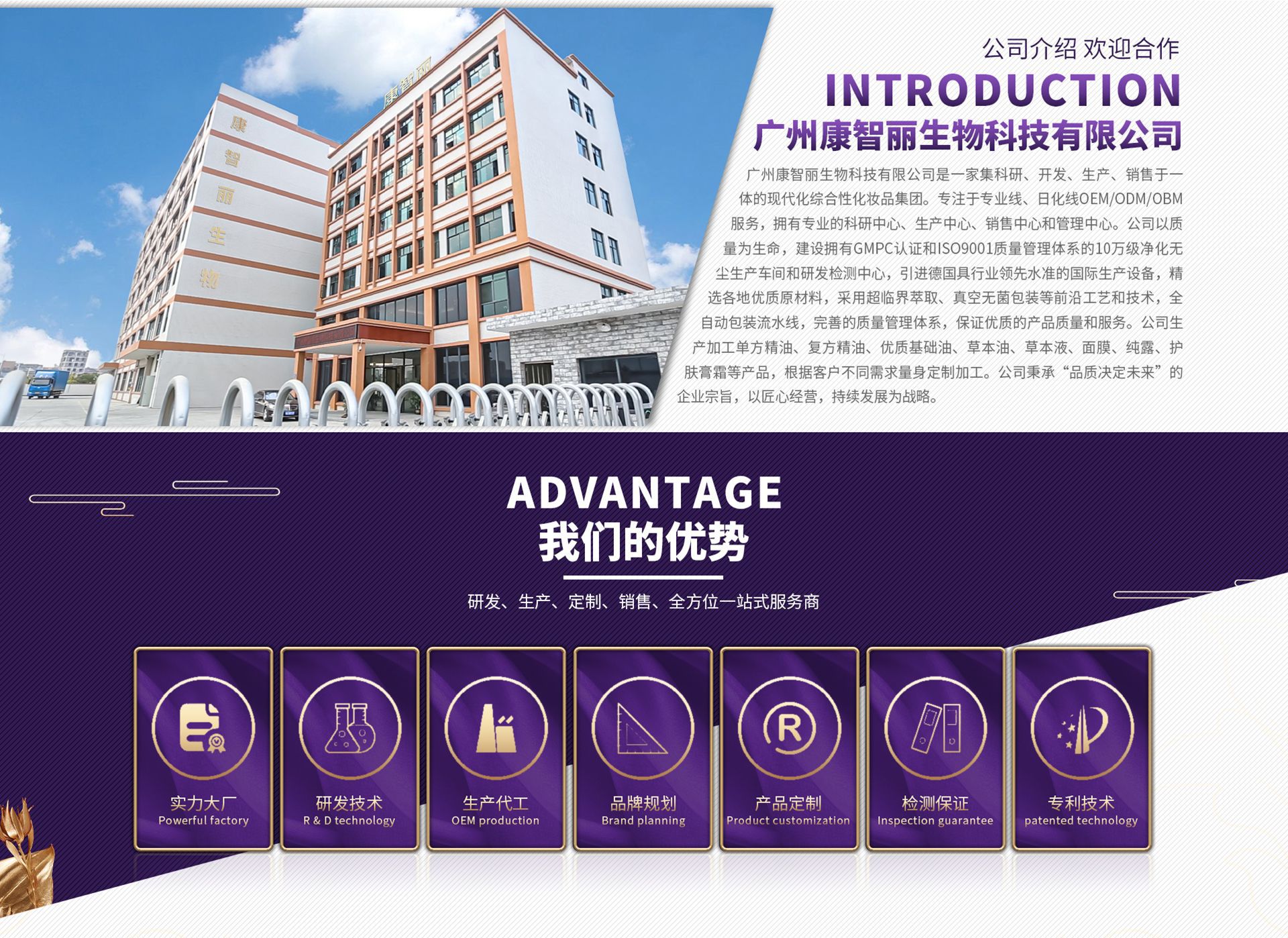 廣州康智麗生物科技有限公司是一家集科研、開發、生產、銷售于一體的現代化綜合性化妝品集團。專注于專業線、日化線OEM/ODM/OBM服務,擁有專業的科研中心、生產中心、銷售中心和管理中心。公司以質量為生命,建設擁有GMPC認證和ISO9001質量管理體系的10萬級凈化無塵生產車間和研發檢測中心,引進德國具行業領先水準的國際生產設備,精選各地優質原材料,采用超臨界萃取、真空無菌包裝等前沿工藝和技術,全自動包裝流水線,完善的質量管理體系,保證優質的產品質量和服務。公司生產加工單方精油、復方精油、優質基礎油、草本油、草本液、面膜、純露、護膚膏霜等產品,根據客戶不同需求量身定制加工。公司秉承“品質決定未來”的企業宗旨,以匠心經營,持續發展為戰略。
