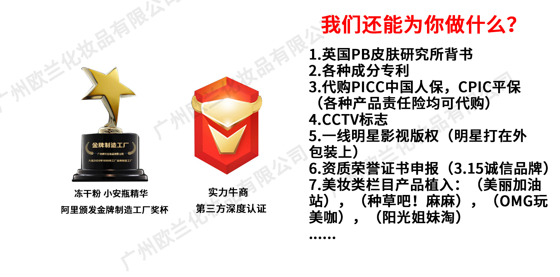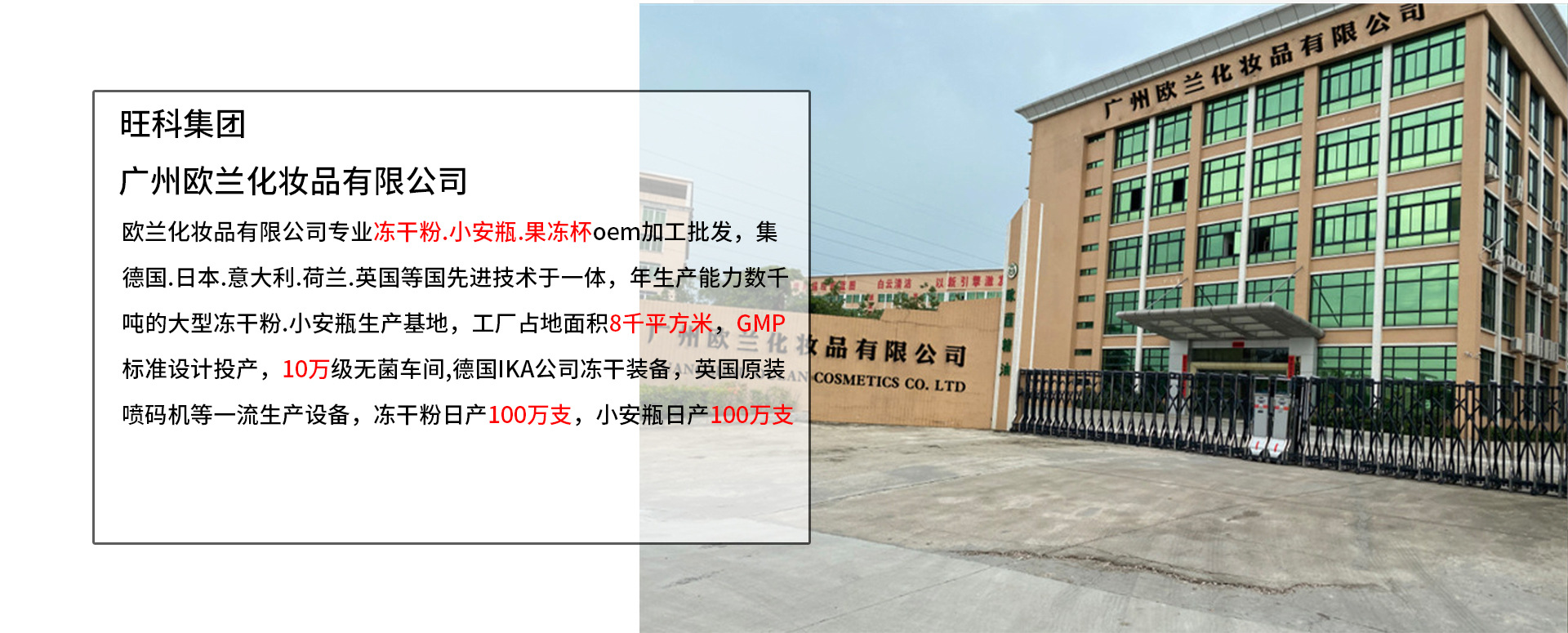 廣州歐蘭化妝品有限公司是一家專業生產凍干粉,安瓶精華,果凍杯,水乳膏霜套盒,面膜,OEM/ODM企業,集研發、服務于一體。化妝品研究開發的!新廠創建于2017年,座落在中國廣州市白云區神山大道西369號建筑面積10000平方米。廠房按照現代化ISO9001標準設計,布局合理,環境優美,生產車間寬敞明亮,配備全套的乳化攪拌、灌裝等先進的生產設備和檢測儀器。多年來已與新加坡、馬來西亞、香港、臺灣等東南亞國家和地區及國內眾多化妝品公司建立了良好的合作關系,創立了多個有影響力的品牌。我公司有著得天獨厚的技術后盾——與軍醫大學有著長期的緊密合作關系,公司經理、總工程師、技術骨干均為軍醫大學或精細化工系畢業。使我公司從產品的設計、配方的制定、原料的選取到廠房的布局、生產過程工藝的保證、產品的成本等都能一直處于行業的領先地位,保證了我公司生產的產品科技含量高,質量可靠、成本低廉。由于公司在技術水平上不斷