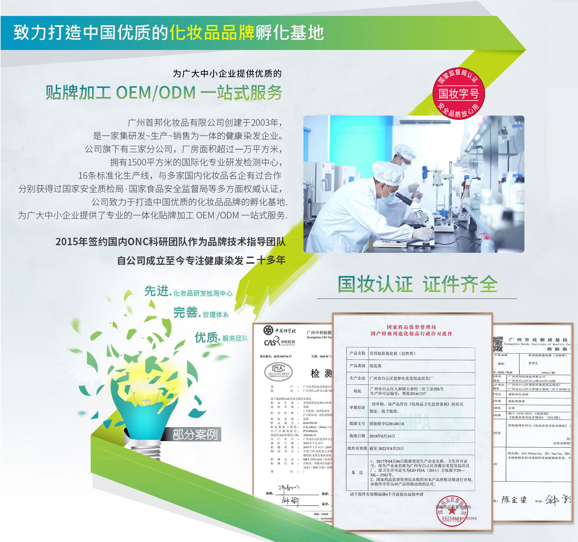 首邦 一個享譽大江南北的民族品牌,一個植物防脫生發及植物染發領域的先驅者。 1999年首邦推出首款防脫育發液,產品具有激活休眠毛囊,促使母毛細胞大量再生,使用者頭發將會日漸濃密,帶來了脫發患者的福音。 廣州市白云區愛夢絲美發用品用具廠系首邦旗下多年來主要生產工廠。工廠主要為本公司自有品牌生產產品亦可承接洗護染燙類產品OEM/ODM代加工業務。工廠擁有自動化、半自動化生產及包裝設備,為生產提供強有力的保證。 廣州市奇彩科技有限公司系首邦旗下專業的毛發色板制作工廠,為全國上千家美發企業及專業線/日化線渠道提供專業的色板制作服務。 詩樺諾(廣東)生物科技有限公司系首邦旗下新工廠,廠址位于廣東云浮,此廠擁有先進的日化廠房機械設備,面積達12000平方米,廠房內部擁有巨大倉庫和10w級的無塵車間。 ——染發類產品為我司深耕多年主營產品,歡迎廣大客戶朋友們洽談合作。