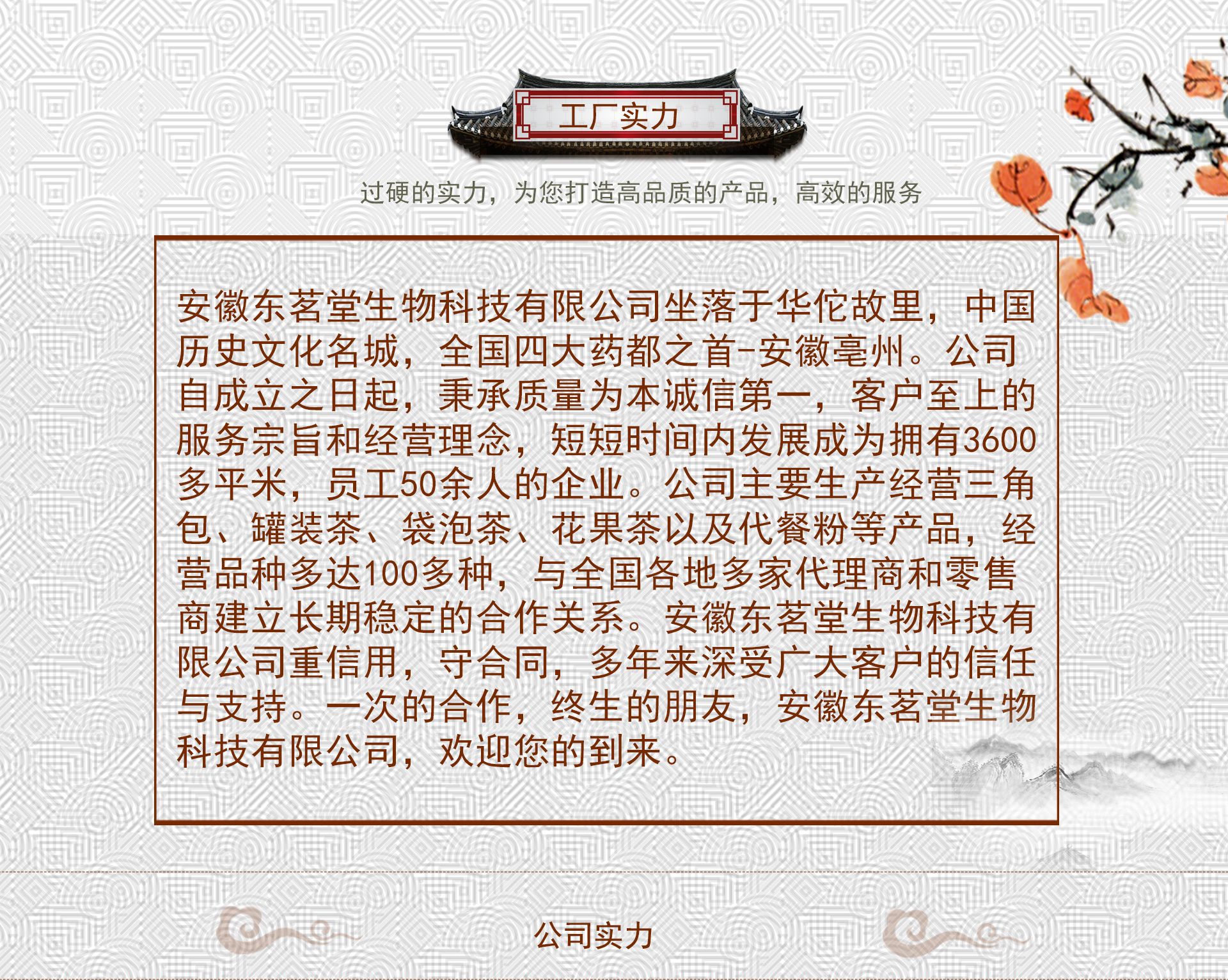 安徽東茗堂生物科技有限公司是養(yǎng)生茶、代餐粉、膏滋、足浴包、固體飲料等產(chǎn)品專業(yè)生產(chǎn)加工的公司,擁有完整、科學(xué)的質(zhì)量管理體系。安徽東茗堂生物科技有限公司的誠信、實(shí)力和產(chǎn)品質(zhì)量獲得業(yè)界的認(rèn)可。歡迎各界朋友蒞臨參觀、指導(dǎo)和業(yè)務(wù)洽談。
