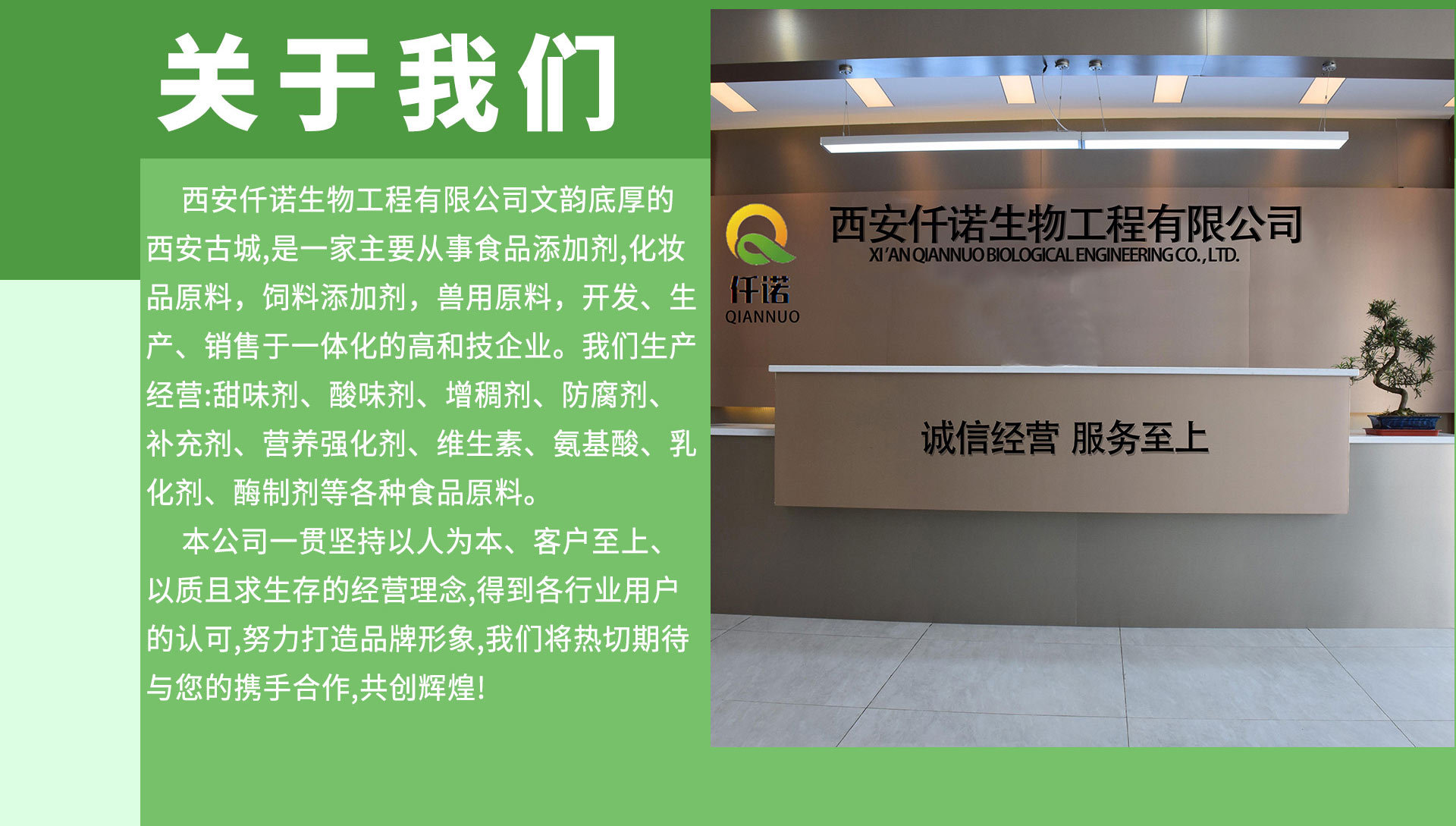 西安仟諾生物工程有限公司是食品添加劑、化妝品原料、獸用原料藥等產(chǎn)品專業(yè)生產(chǎn)加工的公司,擁有完整、科學(xué)的質(zhì)量管理體系。西安仟諾生物工程有限公司的誠信、實(shí)力和產(chǎn)品質(zhì)量獲得業(yè)界的認(rèn)可。歡迎各界朋友蒞臨參觀、指導(dǎo)和業(yè)務(wù)洽談。