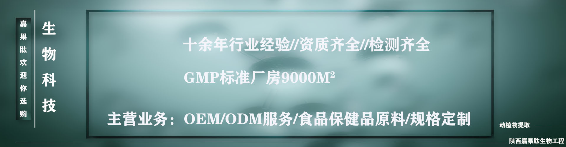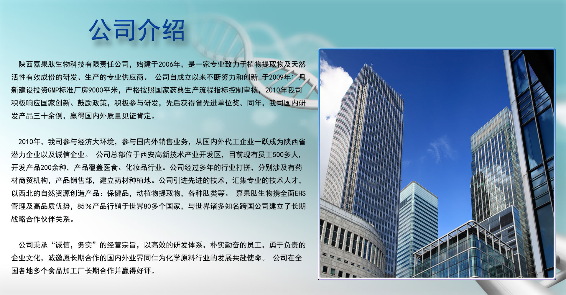 陜西嘉果肽生物科技有限責(zé)任公司,始建于2006年,是一家專業(yè)致力于植物提取物及天然活性有效成份的研發(fā)、生產(chǎn)的專業(yè)供應(yīng)商。 公司自成立以來不斷努力和創(chuàng)新,于2009年1月新建設(shè)投資GMP標(biāo)準(zhǔn)廠房9000平米,嚴(yán)格按照國(guó)家藥典生產(chǎn)流程指標(biāo)控制審核,2010年我司積極響應(yīng)國(guó)家創(chuàng)新、鼓勵(lì)政策,積極參與研發(fā),先后獲得省先進(jìn)單位獎(jiǎng)。同年,我司國(guó)內(nèi)研發(fā)產(chǎn)品三十余例,贏得國(guó)內(nèi)外質(zhì)量見證肯定。2010年,我司參與經(jīng)濟(jì)大環(huán)境,參與國(guó)內(nèi)外銷售業(yè)務(wù),從國(guó)內(nèi)外代工企業(yè)一躍成為陜西省潛力企業(yè)以及誠(chéng)信企業(yè)。 公司總部位于西安高新技術(shù)產(chǎn)業(yè)開發(fā)區(qū),目前現(xiàn)有員工500多人,開發(fā)產(chǎn)品200余種,產(chǎn)品覆蓋醫(yī)食、化妝品行業(yè)。公司經(jīng)過多年的行業(yè)打拼,分別涉及有藥材商貿(mào)機(jī)構(gòu),產(chǎn)品銷售部,建立藥材種植地。公司引進(jìn)先進(jìn)的技術(shù),匯集專業(yè)的技術(shù)人才,以西北的自然資源創(chuàng)造產(chǎn)品:保健品,動(dòng)植物提取物,各種肽類等。 嘉果肽生物攜全面EHS管理及高品質(zhì)優(yōu)勢(shì),85%產(chǎn)品行銷于世界80多個(gè)國(guó)家,與世界諸多知名跨國(guó)公司建立了長(zhǎng)期戰(zhàn)略合作伙伴關(guān)系。公司秉承“誠(chéng)信,務(wù)實(shí)”的經(jīng)營(yíng)宗旨,以高效的研發(fā)體系,樸實(shí)勤奮的員工,勇于負(fù)責(zé)的企業(yè)文化,誠(chéng)邀愿長(zhǎng)期合作的國(guó)內(nèi)外業(yè)界同仁為化學(xué)原料行業(yè)的發(fā)展共赴使命。 公司在全國(guó)各地多個(gè)食品加工廠長(zhǎng)期合作并贏得好評(píng)。 品牌理念:科技創(chuàng)品牌,信譽(yù)求發(fā)展。 經(jīng)營(yíng)宗旨:為客戶提供滿意的產(chǎn)品。 服務(wù)理念:真誠(chéng)、周到、主動(dòng)、規(guī)范