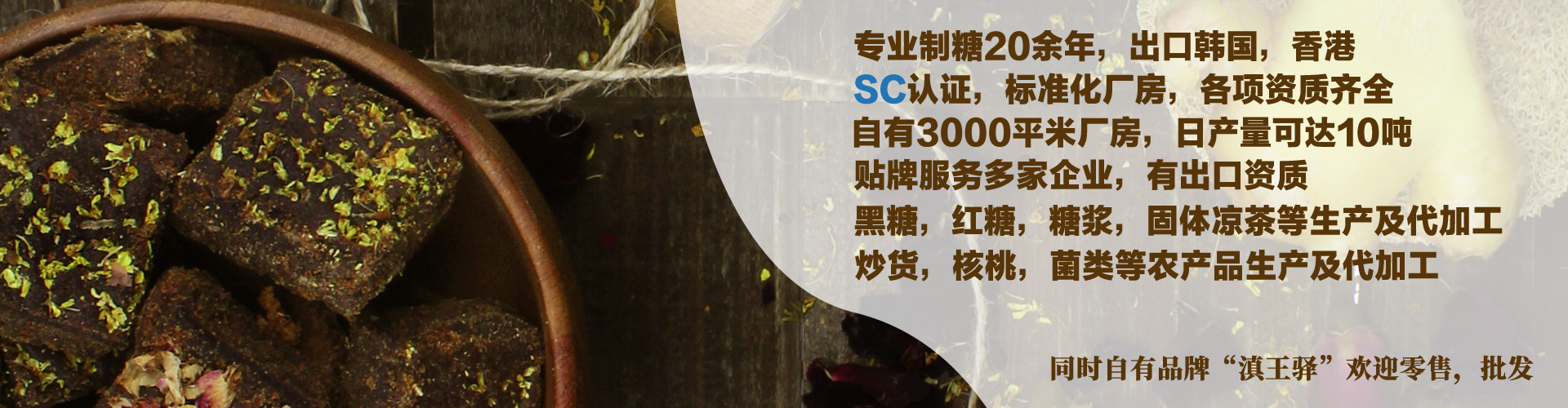 云南滇王驛農業科技開發有限公司2000年成立。企業是“云南省農業產業化重點龍頭企業”、“云南省農產品深加工科技型企業” 、“楚雄州規模以上企業”及“云南省科技型中小企業”,“國家級高新技術企業”被列為“中國農業部農產品加工業景氣監測固定觀察點”、企業商標“滇王驛”是“云南省著名商標,是楚雄州萬企幫萬村扶貧明星企業。多年耕耘,企業通過了HACCP、ISO9000、ISO22000食品質量安全管理體系認證,已獲專利證書26項,報批審核的發明專利2項,生產資質6項。 公司糖制品業務產值達到3千多噸,“滇王驛紅糖、黑糖”,“樹立了云南高原紅糖在國內消費者心中的地位,奠定了全國消費者對“云南高原紅糖、黑糖”的價值感及認同感. 公司除生產自有品牌“滇王驛”外,還為國內眾多企業做OEM貼牌代工。 歡迎代理批發、貼牌代工 OEM 。