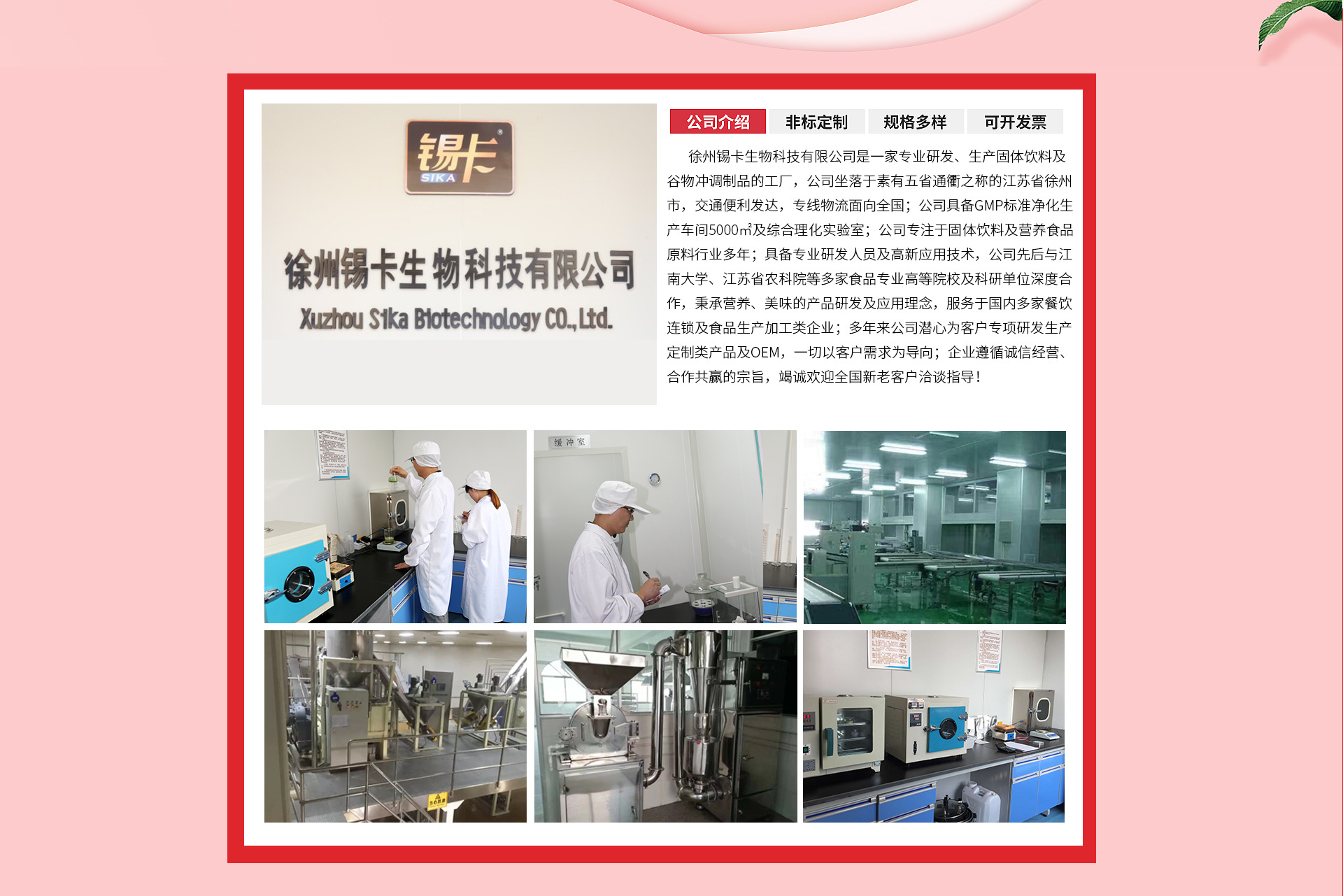 徐州錫卡生物科技有限公司是固體飲料、意式冰淇淋粉、椰子粉、熟化玉米粉、熟化燕麥粉、大米粉、煉乳風味粉、牛乳風味粉、烤奶風味粉、速溶豆奶粉等產(chǎn)品專業(yè)生產(chǎn)加工的公司,擁有完整、科學的質(zhì)量管理體系。徐州錫卡生物科技有限公司的誠信、實力和產(chǎn)品質(zhì)量獲得業(yè)界的認可。歡迎各界朋友蒞臨參觀、指導和業(yè)務(wù)洽談