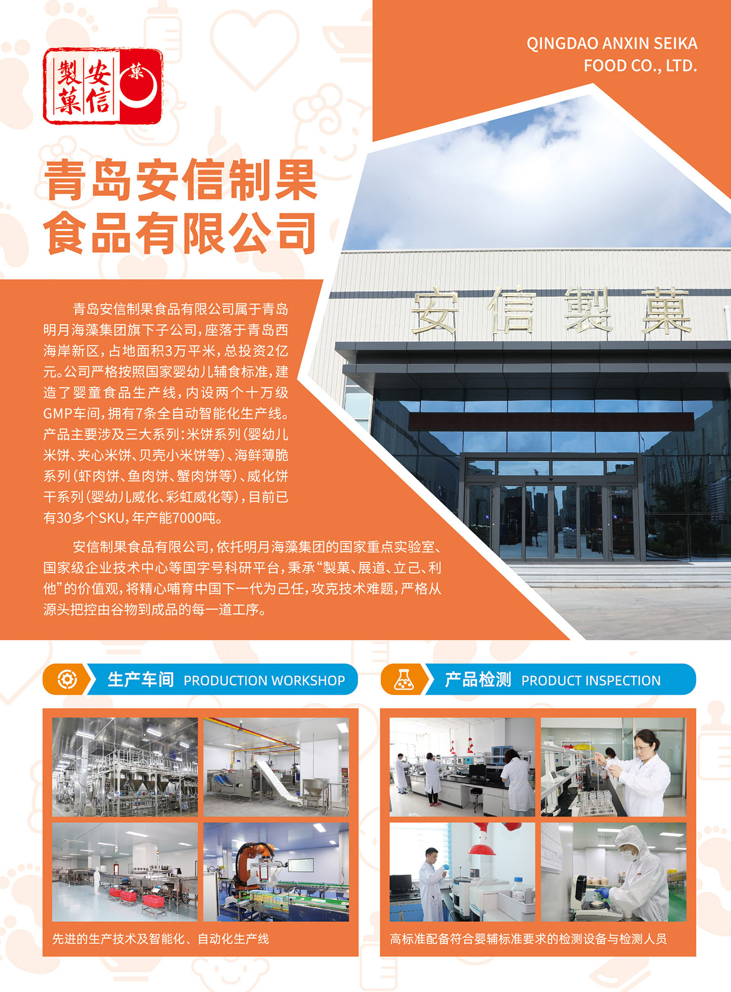 青島安信制果食品有限公司屬于青島明月海藻集團旗下子公司,座落于青島西海岸新區,占地面積3萬平米,總投資2億元。公司嚴格按照國家嬰幼兒輔食標準,建造了嬰童食品生產線,內設兩個十萬級GMP車間,擁有7條全自動智能化生產線。產品主要涉及三大系列:米餅系列(嬰幼兒米餅、夾心米餅、貝殼小米餅等)、海鮮薄脆系列(蝦肉餅、魚肉餅、蟹肉餅等)、威化餅干系列(嬰幼兒威化、彩虹威化等),目前已有30多個SKU,年產能7000噸。