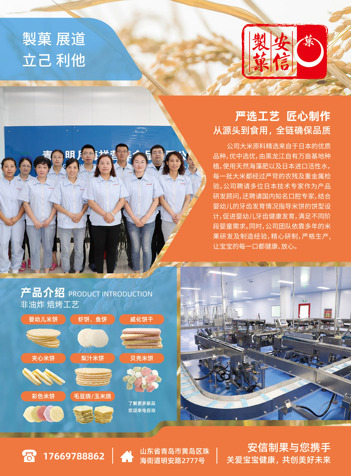 公司大米原料精選來自于日本的優質品種,優中選優,由黑龍江自有萬畝基地種植,使用天然海藻肥以及日本進口活性水,每一批大米都經過嚴苛的農殘及重金屬檢驗。公司聘請多位日本技術專家作為產品研發顧問,還聘請國內知名口腔專家,結合嬰幼兒的牙齒發育情況指導米餅的餅型設計,促進嬰幼兒牙齒健康發育,滿足不同階段嬰童需求。同時,公司團隊依靠多年的米果研發及制造經驗,精心研制,嚴格生產,讓寶寶的每一口都健康、放心。