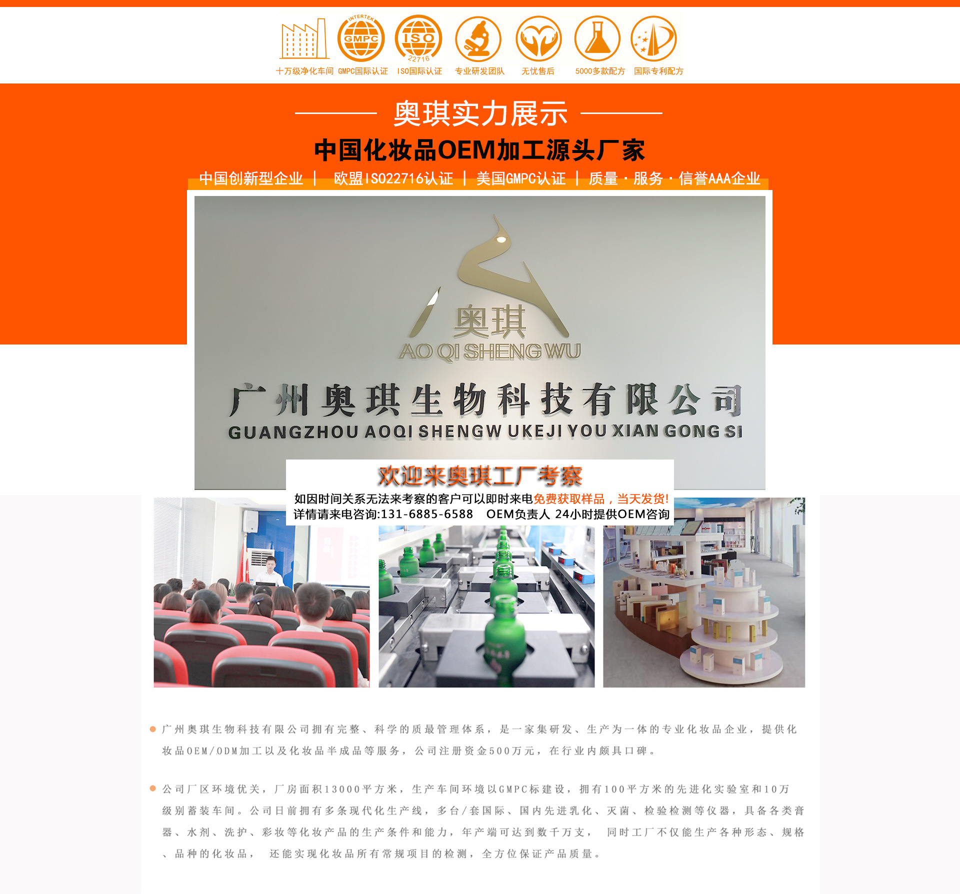 廣州奧琪生物科技 主要經營加工 :水、乳、霜、精華、原液、面膜、護膚類產品、洗護類產品