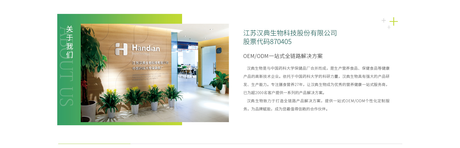漢典生物(股票代碼870405)是與中國藥科大學保健品廠合并而成,是生產營養食品、保健食品等健康產品的專業廠家。 依托于中國藥科大學的技術力量,漢典生物具有強大的產品研發、生產能力。 專注膳食營養20年,讓漢典生物成為優秀的營養健康一站式服務商,已為超2000名客戶提供一系列的產品解決方案。