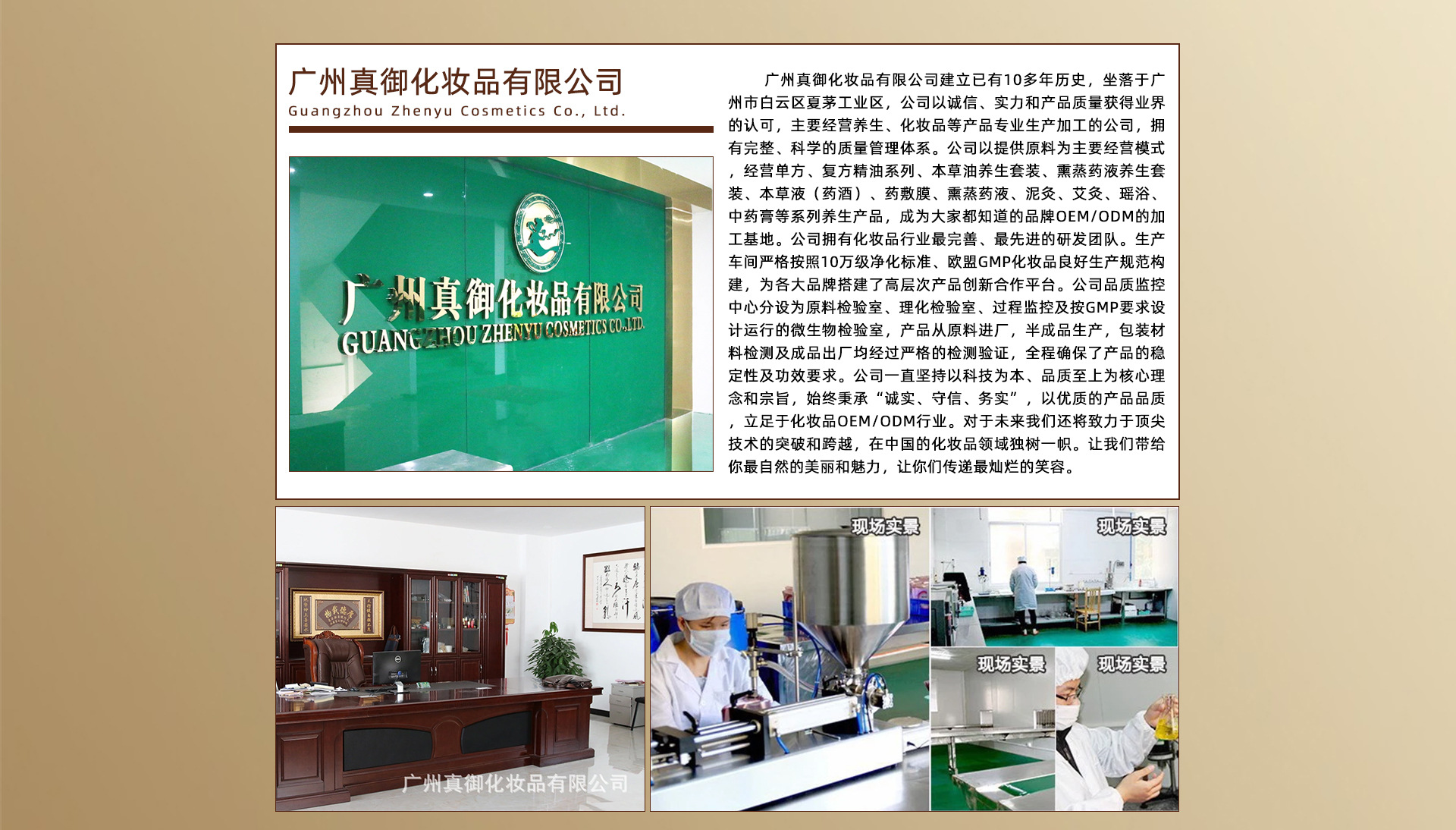 廣州真御化妝品有限公司建立已有10多年歷史,坐落于廣 州市白云區(qū)夏茅工業(yè)區(qū),公司以誠(chéng)信、實(shí)力和產(chǎn)品質(zhì)量獲得業(yè)界 的認(rèn)可,主要經(jīng)營(yíng)養(yǎng)生、化妝品等產(chǎn)品專業(yè)生產(chǎn)加工的公司,擁 有完整、科學(xué)的質(zhì)量管理體系。公司以提供原料為主要經(jīng)營(yíng)模式 ,經(jīng)營(yíng)單方、復(fù)方精油系列、本草油養(yǎng)生套裝、熏蒸藥液養(yǎng)生套 裝、本草液(藥酒)、藥敷膜、熏蒸藥液、泥灸、艾灸、瑤浴、 中藥膏等系列養(yǎng)生產(chǎn)品,成為大家都知道的品牌OEM/ODM的加 工基地。公司擁有化妝品行業(yè)最完善、最先進(jìn)的研發(fā)團(tuán)隊(duì)。生產(chǎn) 車間嚴(yán)格按照10萬(wàn)級(jí)凈化標(biāo)準(zhǔn)、歐盟GMP化妝品良好生產(chǎn)規(guī)范構(gòu) 建,為各大品牌搭建了高層次產(chǎn)品創(chuàng)新合作平臺(tái)。公司品質(zhì)監(jiān)控 中心分設(shè)為原料檢驗(yàn)室、理化檢驗(yàn)室、過(guò)程監(jiān)控及按GMP要求設(shè) 計(jì)運(yùn)行的微生物檢驗(yàn)室,產(chǎn)品從原料進(jìn)廠,半成品生產(chǎn),包裝材 料檢測(cè)及成品出廠均經(jīng)過(guò)嚴(yán)格的檢測(cè)驗(yàn)證,全程確保了產(chǎn)品的穩(wěn) 定性及功效要求。
