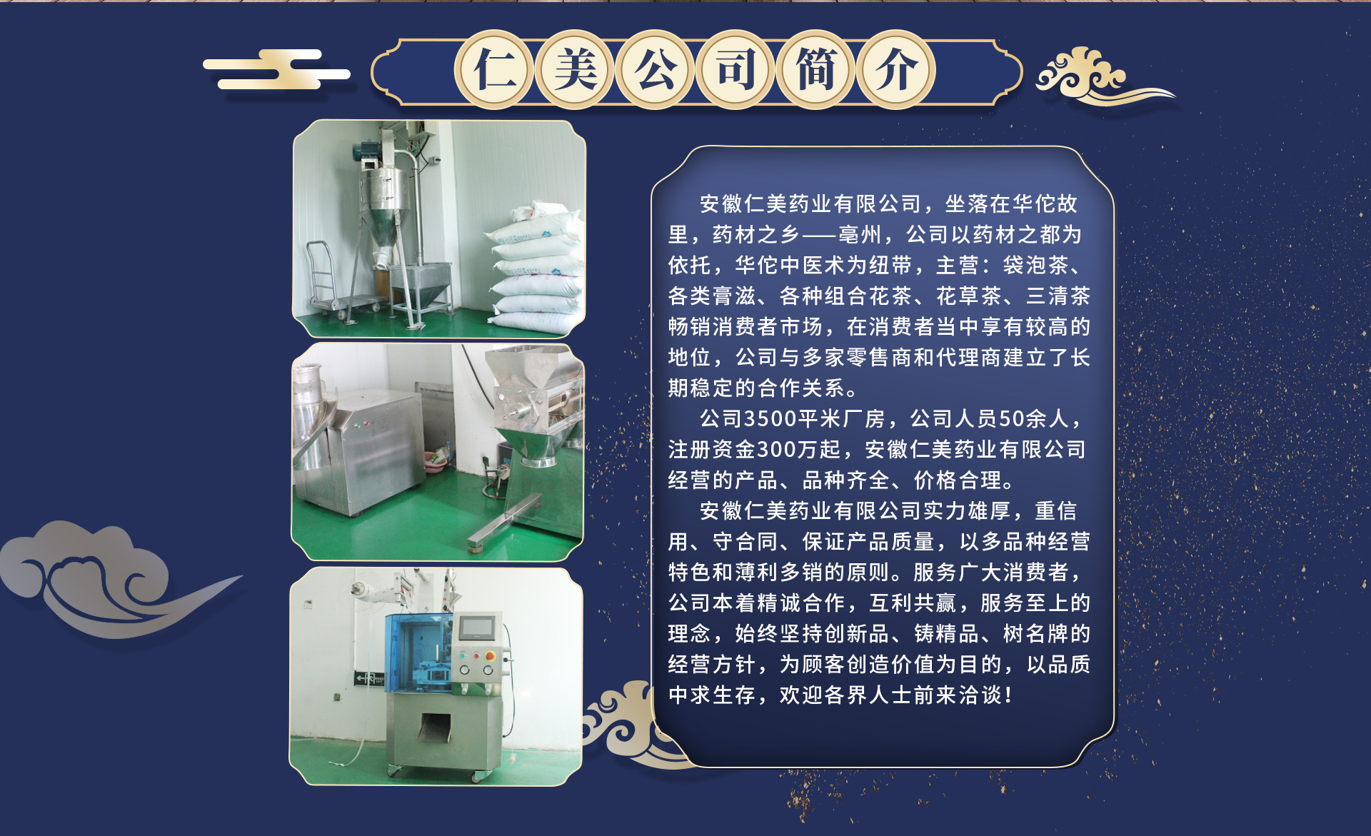 安徽仁美有限公司主要生產膏滋、袋泡茶、固體飲料、黑芝麻丸、三角包、罐裝花茶等產品,擁有完整、科學的質量管理體系。常年與各大電商平臺合作,出貨穩定,質量可靠,獲得業界一致好評。歡迎各界朋友蒞臨參觀、指導和業務洽談年交易額