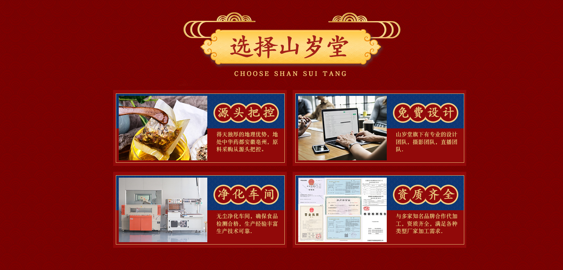 亳州市山歲堂生物科技有限-公司位于三朝古都,華佗故里,中國歷史文化名城,四大藥都之一-安徽省亳州市。公司占地面積26000多平方米,現有生產員工300余人,擁有產品500多種,建有搽劑、片劑、、顆粒劑、液體制劑、膏劑、保健酒6條生產線,是一個以中藥生產、經營、研發為一體的現代化企業。在山歲堂公司的發展史上受到各級的關懷及業界人士的認可, 幾年來公司秉承“質量優良、誠信為本、用良心治好藥食品”的經營理念,確保人民食品放心,身心健康,為讓食品經濟大發展做出更大貢獻