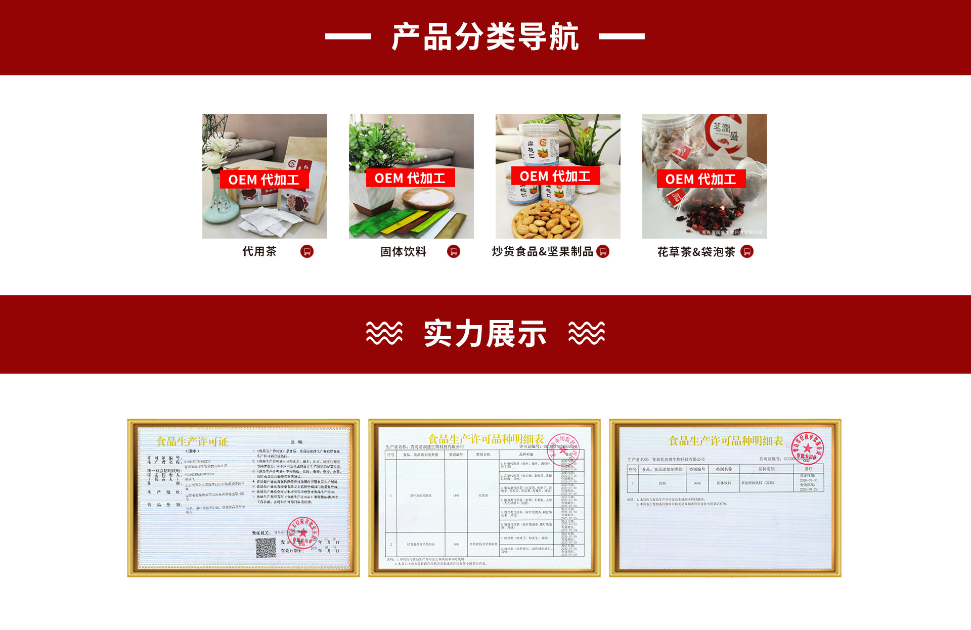 公司主營代用茶,袋泡茶,固體飲料,炒貨食品及堅果制品等產品的專業oem委托生產加工和銷售。公司秉承“顧客至上,服務第一”的經營理念,堅持“質量為先”的原則為廣大客戶提供服務,因為專注所以專業!