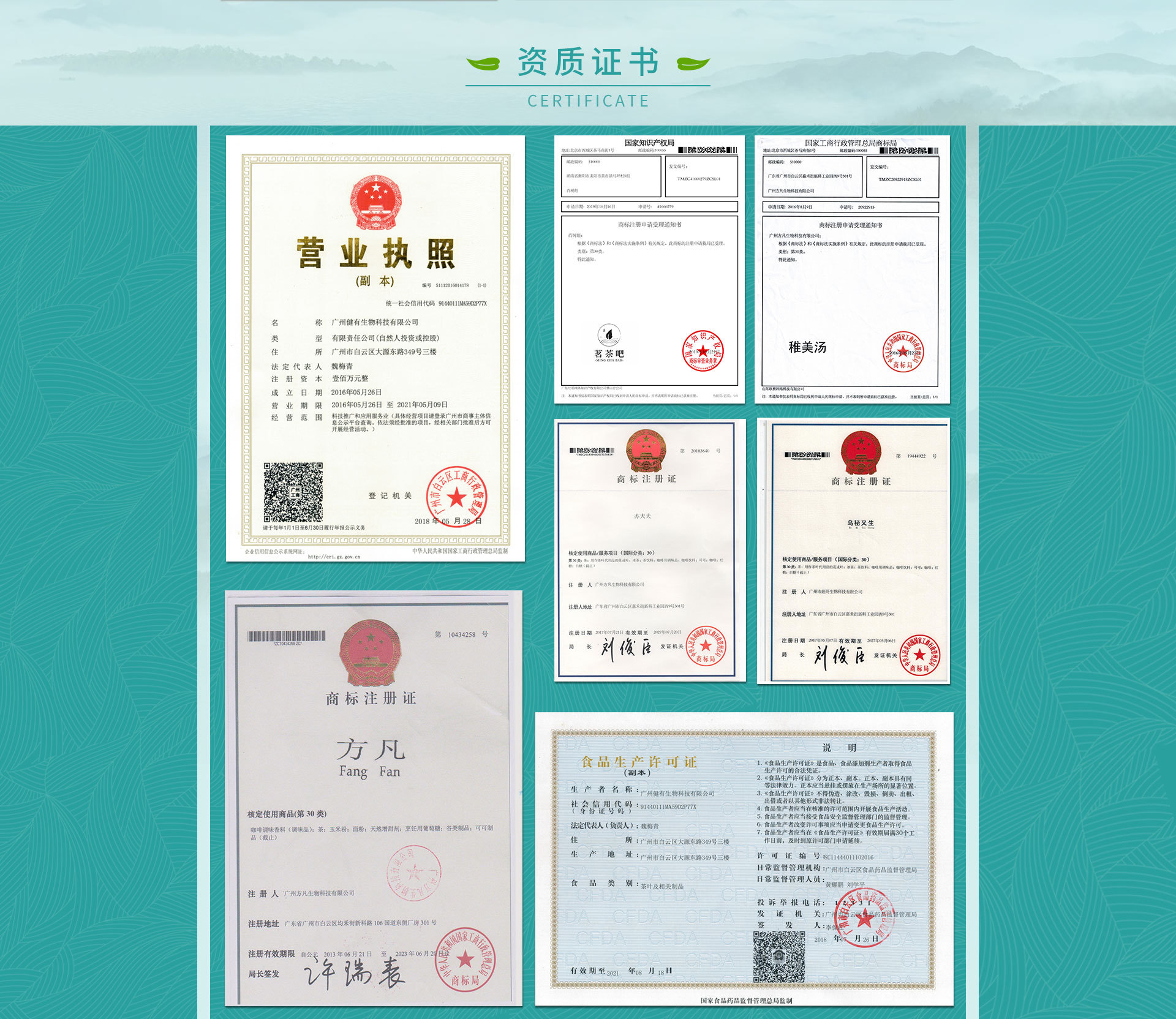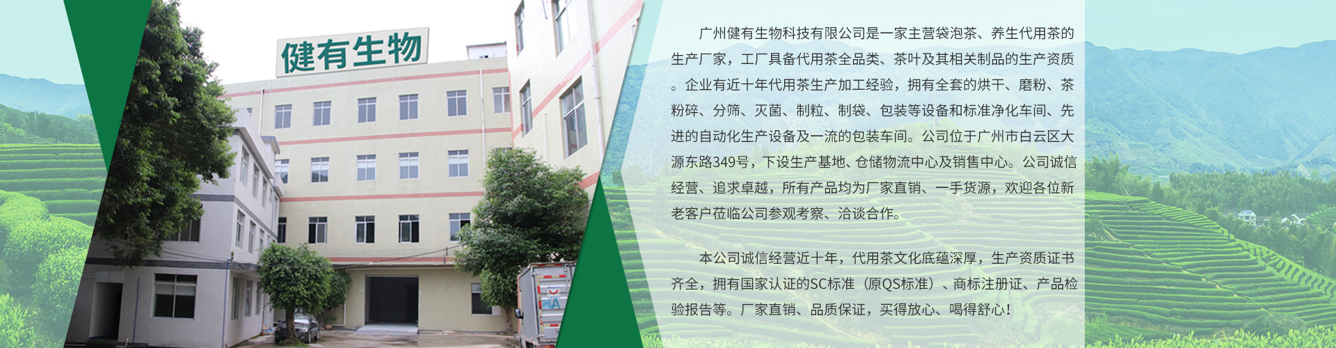 廣州市健有生物科技有限公司由原“方凡”品牌團隊注資建設成立,生產基地位于廣州市白云區,至今在生產制作養生代用茶領域已有十六年行業經驗,公司目前在傳統養生代茶飲及現代時尚花草茶產品生產加工項目已取得長足進步,為眾多馳名品牌提供貼牌代加工服務。公司堅持“綠色 健康 傳承”的工廠品牌經營理念,積極打造養生代用茶行業良好口碑,確保工廠的高服務水準及產品的高質量。 企業通過了代用茶及茶葉分裝SC生產許可資質認證,產品生產資質齊全。固定資產方面擁有全套的烘干、磨粉、茶粉碎、分篩、滅菌、制粒、制袋、包裝等生產設備,標準化車間生產線,滿足各式茶葉分裝及代用茶的生產加工需求。企業下設生產基地占地總面積5000平方米,生產部、業務部、行政部多部門協作,是集研發、生產、銷售于一體的綜合性企業。