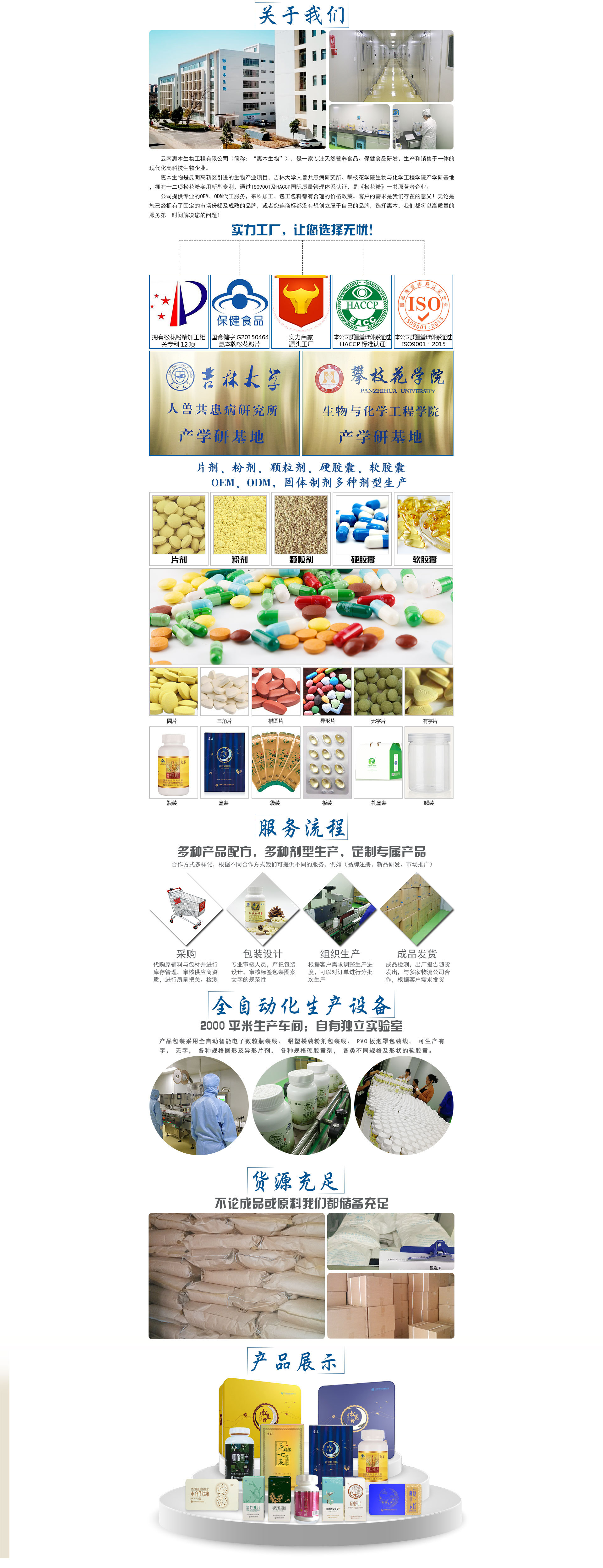 云南惠本生物工程有限公司,是一家專注營養保健食品研發、生產和銷售于一體的現代化高科技生物企業。公司提供各類保健品、營養品、新資源食品、藥食同源食品OEM,ODM貼牌生產代加工等服務。我們擁有專業的研發團隊和設計團隊,擁有專業的實驗室、化驗室,提供研發新產品配方、升級原有產品配方,設計產品外包裝等服務。云南惠本將為您提供一站式服務,量身定制屬于您的產品