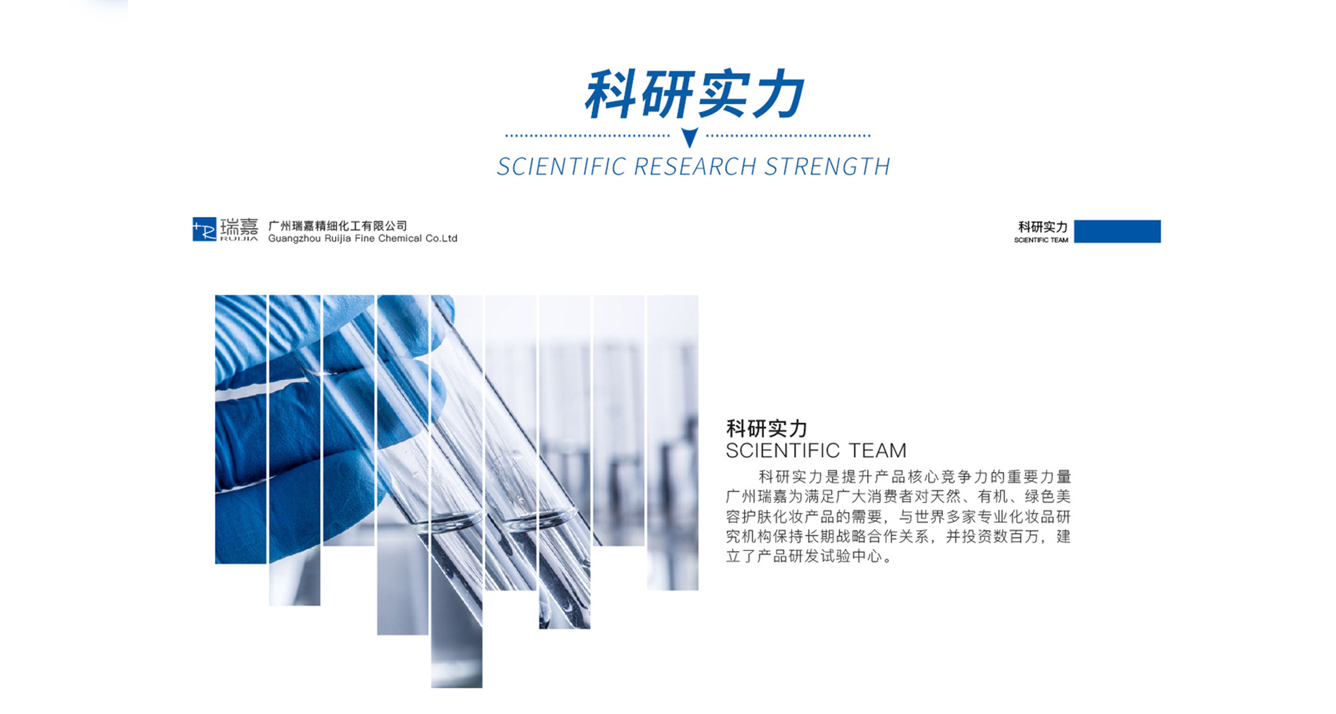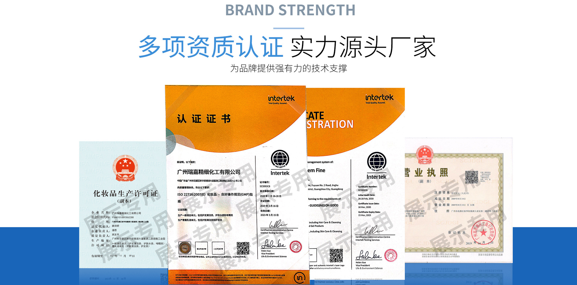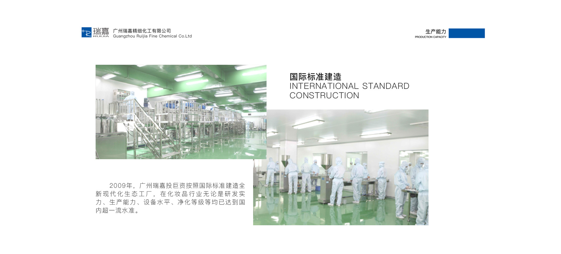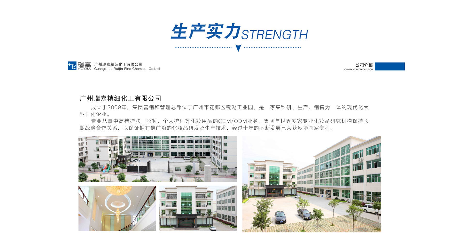 廣州瑞嘉精細化工有限公司,成立于2009年,位于廣州市花都區風景優美鏡湖工業園,占地面積22000平米是一家集科研、生產、銷售為一體的現代化大型化妝品企業。專業從事中高檔護膚、彩妝、個人護理等化妝用品的OEM/ODM業務。公司擁有9條全自動的生產流水線,月產能面膜1500萬片,水乳膏霜450萬瓶起,目前已經取得了INTERTEK歐洲理事會及美國食品藥品監督管理局GMP10萬級相關認證。 公司深耕化妝品行業多年,為世界著名企業生產了多種專業產品,當下更是精準把握時代脈搏,在社交電商平臺和直播帶貨的風口,鎖定新流量新渠道市場,幫助品牌商、渠道商孵化了一個又一個的爆品,如“貓爪手膜”、 “小肌蛋果凍杯面膜”等等,因此,在行業內被譽為為“網紅直播選品基地”、“團購爆品孵化搖籃”。