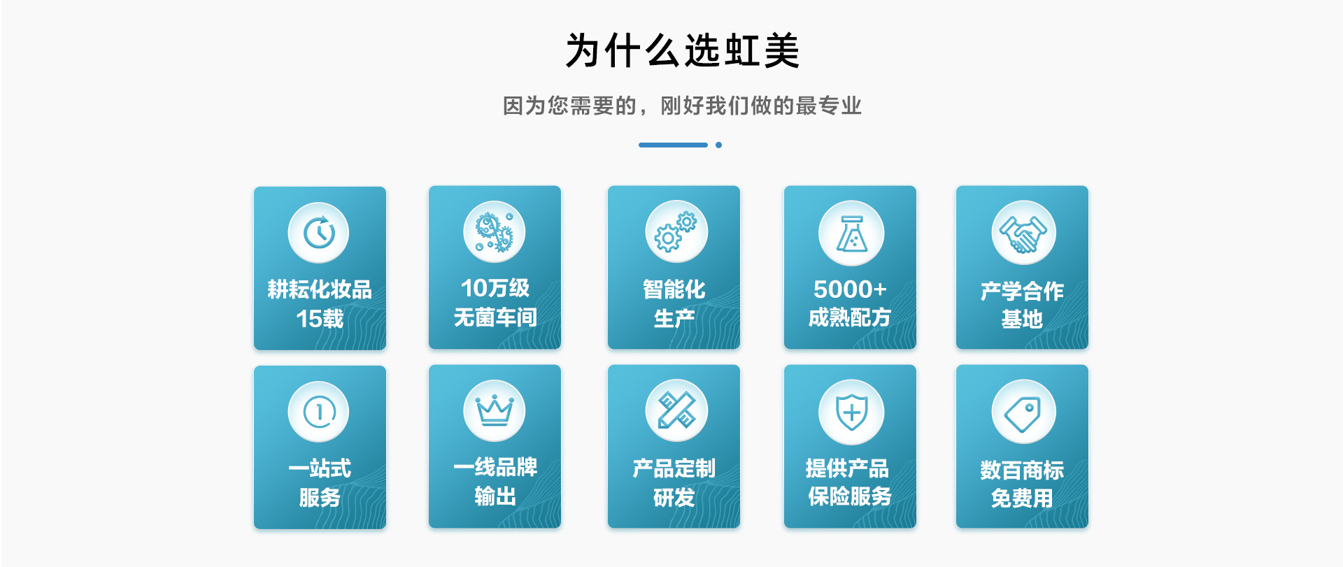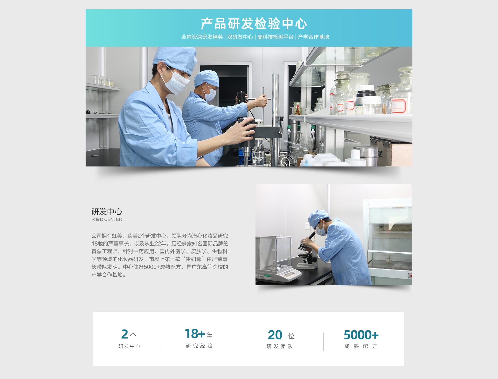 廣州虹美生物科技有限公司是OEM護膚品代工、ODM護膚品代、OEM化妝品代工、ODM化妝品代等產品專業生產加工的公司,擁有完整、科學的質量管理體系。 廣州虹美生物科技有限公司,前身是廣州市顏姬化妝品有限公司,創建于2007年,十四年歷程,2017年公司調整為“雙基地”模式即“藥美研發中心”與“迪美生產基地”; GMPC生產標準,十萬級凈化無菌車間,總占地面積2萬平方,大量先進的生產設備,實現專利成分的高質量生產。 以中藥應用、國內外醫學、皮膚學、生物科技為主導的高新技術企業, 強大的研發團隊,擁有多名業內資深工程師針對中藥應用、國內外醫學、皮膚學、生物科技等領域的化妝品研發。 虹美公司優勢 1、生產優勢 三大生產基地,占地面積為2萬多平方的工廠,生產程序嚴格遵照GMPC生產標準,擁有先進的生產設備及一流生產環境。通過全封閉生產車間配以高級空氣凈化系統及消毒系統,灌裝設備應用氣動裝置