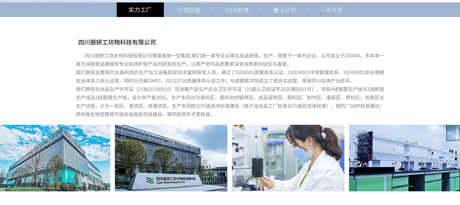 四川麗妍工坊生物科技有限公司隸屬美麗一生集團,我們是一家專業從事化妝品研發、生產、銷售于一體的企業。公司成立于2003年,多年來一直為詩麗堂品牌提供專業院線護膚產品的研發和生產,以其嚴苛的品質要求深受消費者的信任與喜愛。 我們擁有全套現代化高科技的生產加工設備和經驗豐富的研發人員,通過了ISO9001質量體系認證、ISO24001環境管理體系、ISO45001職業健康安全體系三標認證榮,同時已開展GMPC、ISO22716質量體系認證工作;與成都醫學院成立了聯合實驗室,榮獲四川名牌產業稱號。