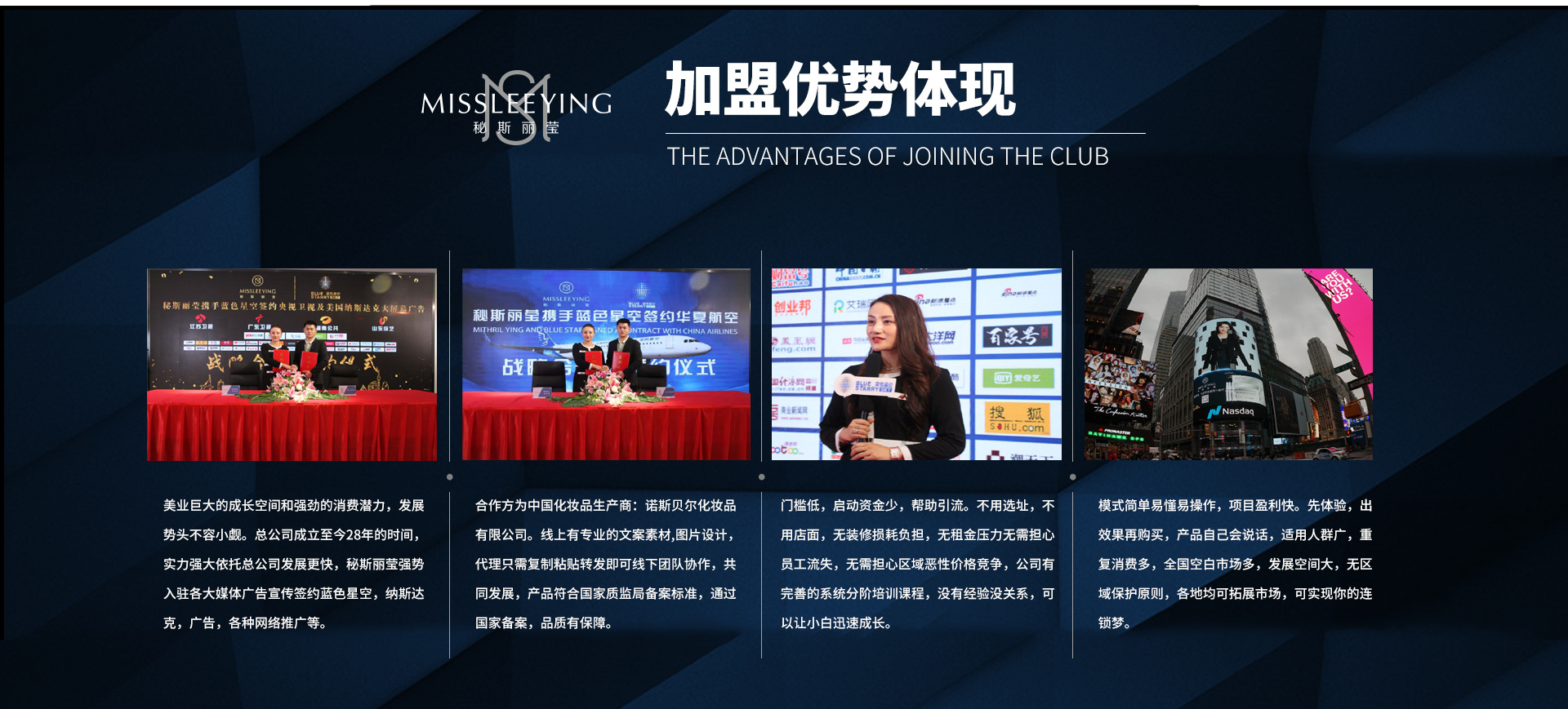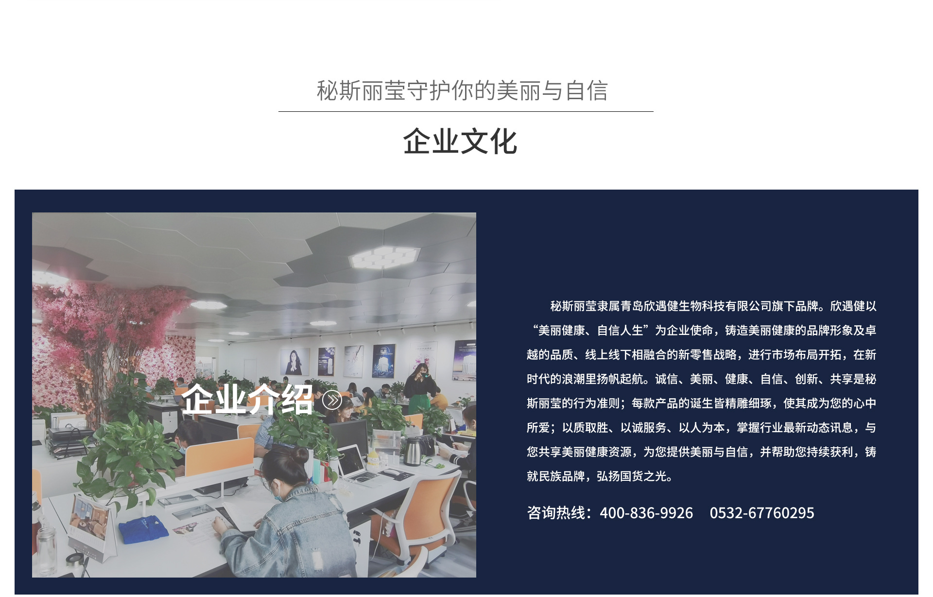 青島欣遇健是青島倍力商貿(mào)的子公司。青島倍力商貿(mào)有限公司成立于1992年,注冊(cè)資金1280萬元,公司自有土地面積四十余畝,建筑面積兩萬五千多平方,現(xiàn)有一百五十多名員工,自有現(xiàn)代化辦公場(chǎng)所及倉儲(chǔ)基地,是一家從事輪胎、潤滑油的銷售公司,在業(yè)界享負(fù)盛名;銷售網(wǎng)絡(luò)遍布山東全境及連云港地區(qū),擁有廣泛的客戶基礎(chǔ)及市場(chǎng)渠道;以卡客車、轎車、工業(yè)、工程車等一應(yīng)俱全的高性能輪胎服務(wù)2000余家輪胎銷售商及終端車隊(duì)和集團(tuán)大客戶,以車用油、工業(yè)用油、工程機(jī)械用油等高檔專用潤滑油服務(wù)于600余家潤滑油銷售商及終端車隊(duì)和集團(tuán)大客戶 秘斯麗瑩隸屬青島欣遇健生物科技有限公司旗下品牌。欣遇健以“美麗健康、自信人生”為企業(yè)使命,鑄造美麗健康的品牌形象及卓越的品質(zhì);線上線下相融合的新零售戰(zhàn)略,進(jìn)行市場(chǎng)布局開拓,在新時(shí)代的浪潮里起航。以質(zhì)取勝、以誠服務(wù)、以人為本,掌握行業(yè)最新動(dòng)態(tài)訊息,與您共享美麗健康資源,為您提供美麗與自信。