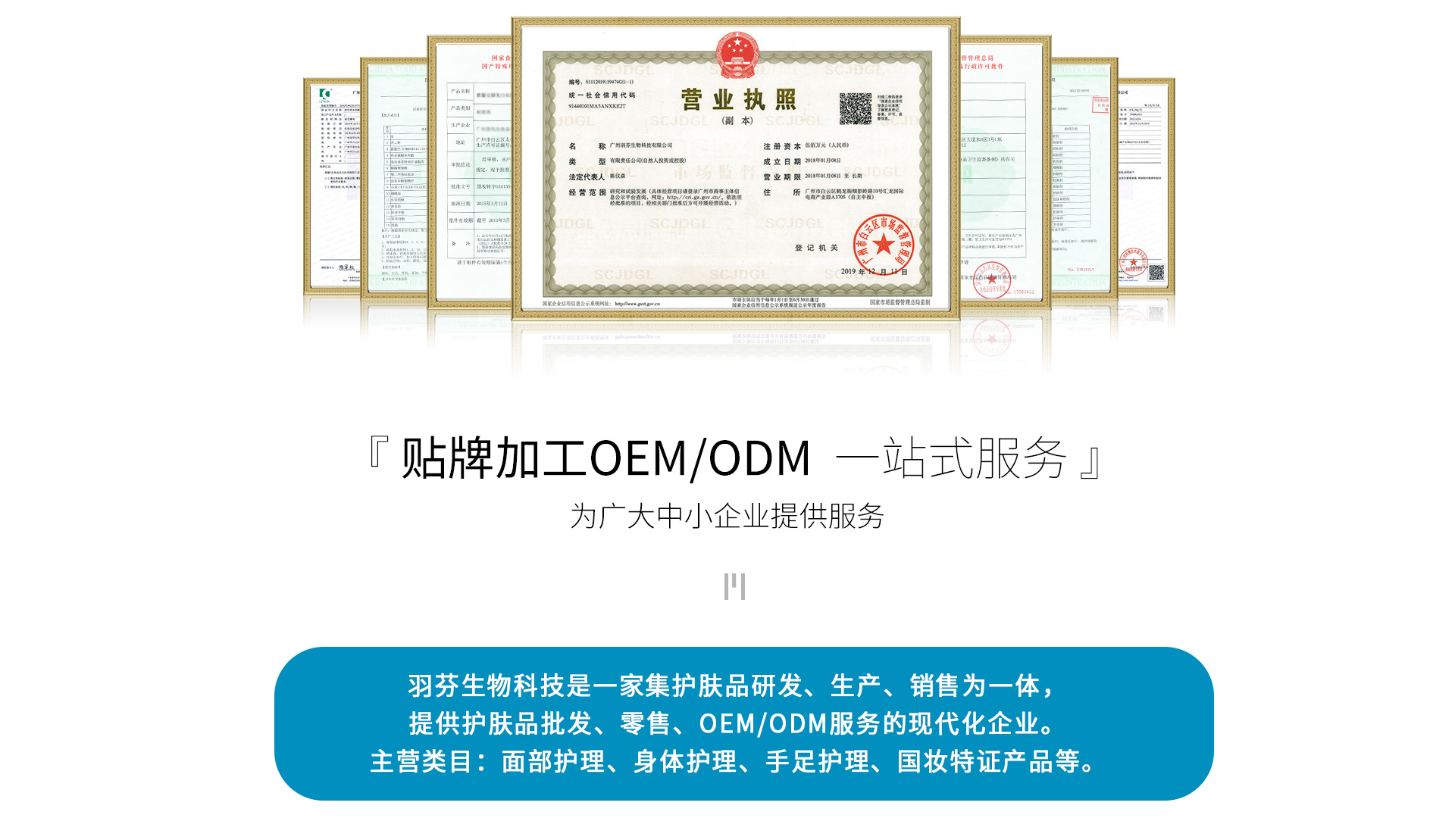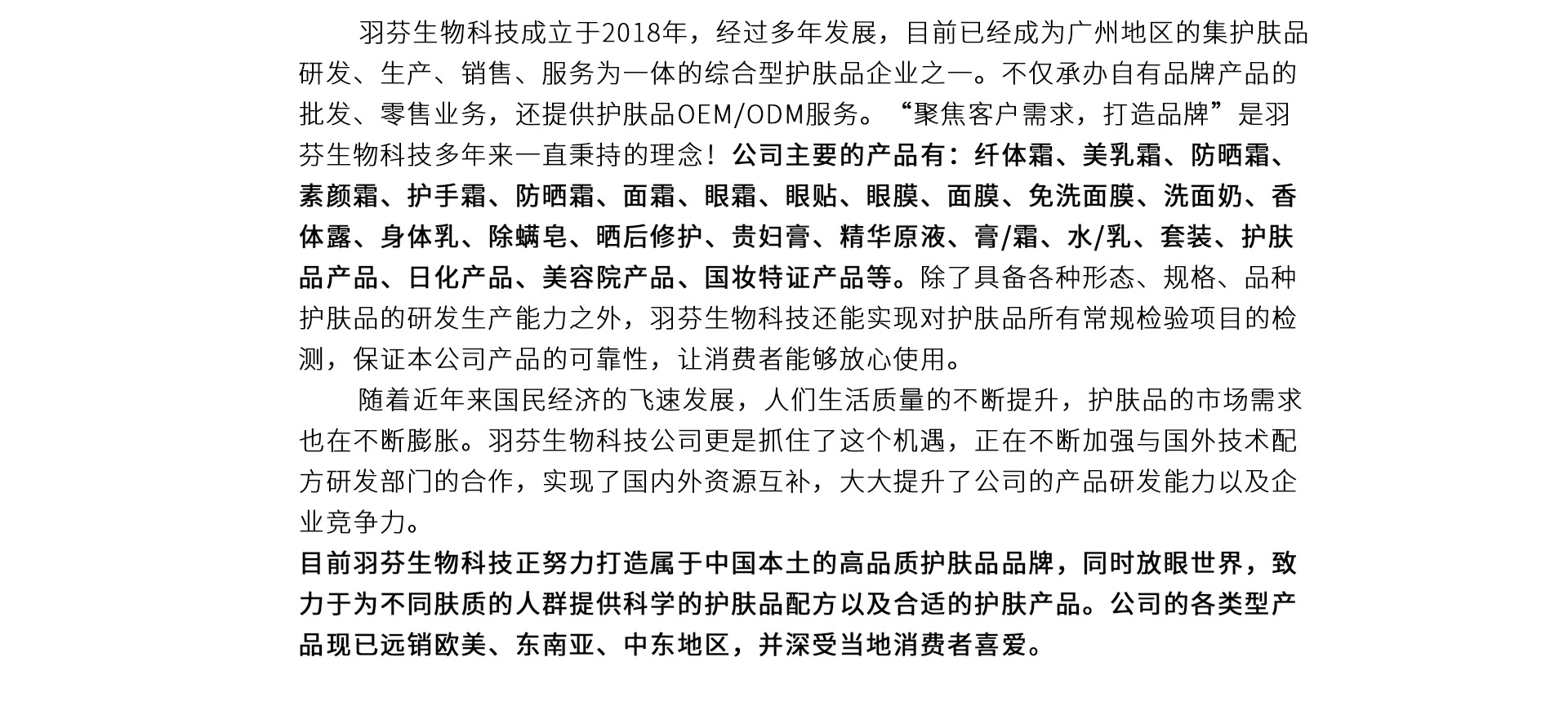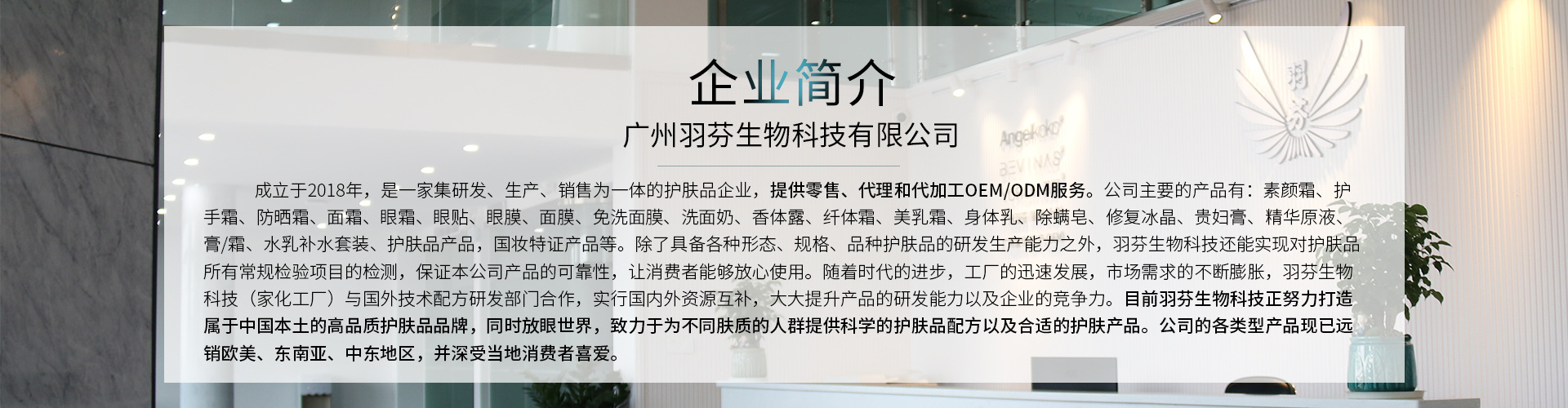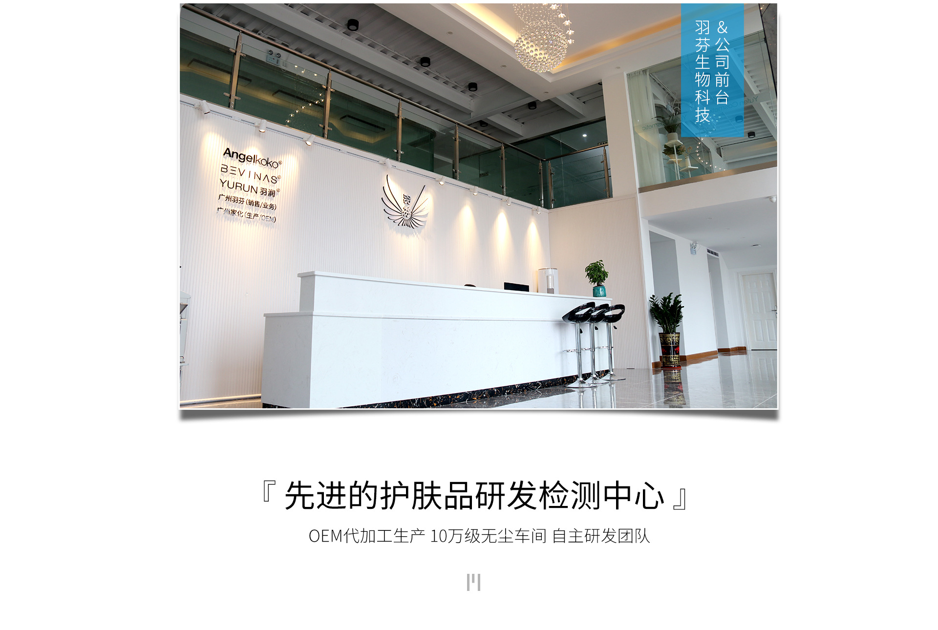 廣州羽芬生物科技有限公司是化妝品、美容護膚產品加工、化妝品原料、包材等產品專業生產加工的公司,擁有完整、科學的質量管理體系。廣州羽芬生物科技有限公司的誠信、實力和產品質量獲得業界的認可。歡迎各界朋友蒞臨參觀、指導和業務洽談。