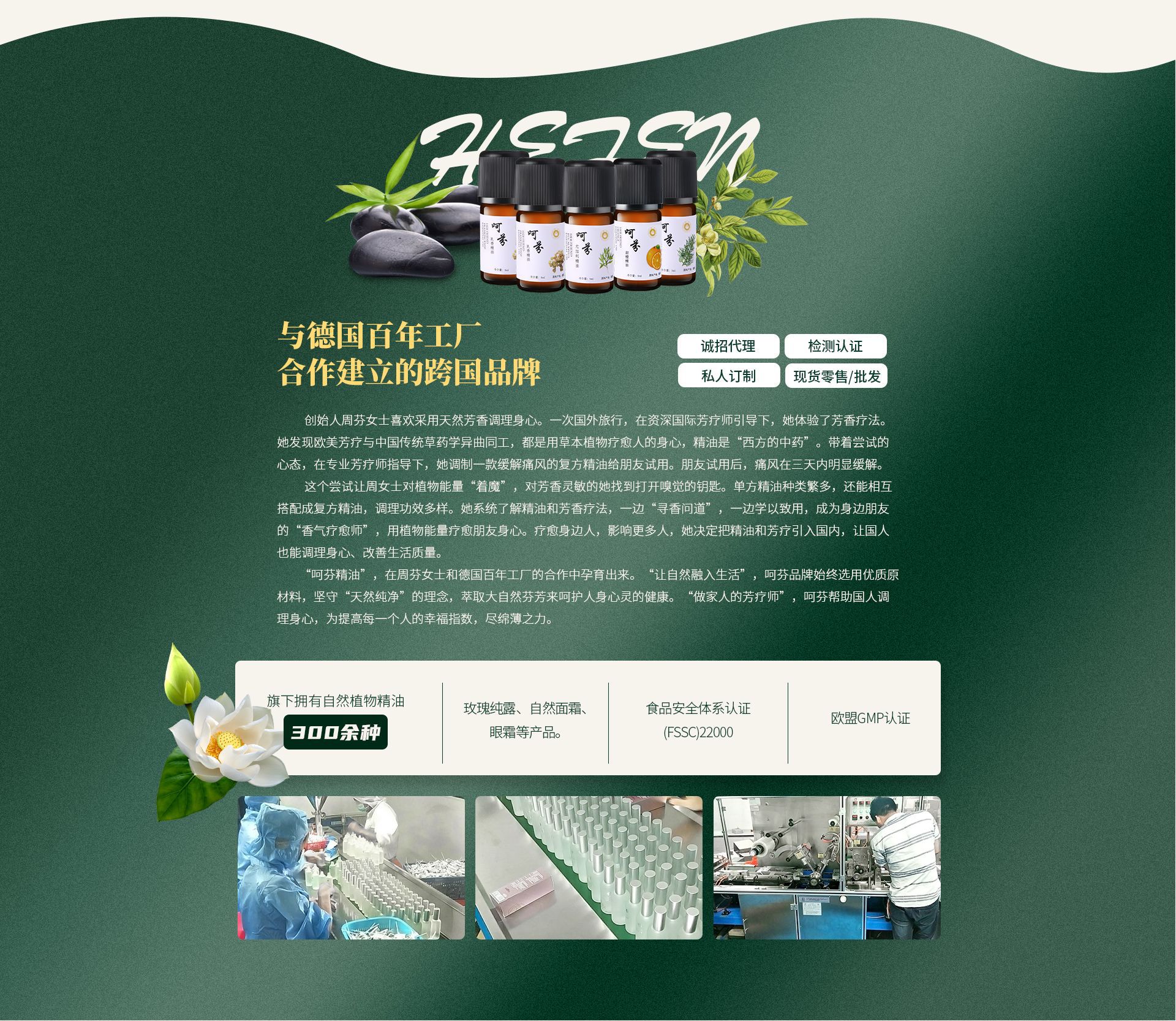 呵芬精油是珠海呵芬精油有限公司與德國百年工廠合作建立的跨國品牌,產(chǎn)品由德國制造商生產(chǎn),呵芬公司直接進口經(jīng)營。旗下?lián)碛?300 余種植物精油,以及玫瑰純露、植物精華液和面霜等產(chǎn)品。 呵芬品牌結(jié)合中西技法及理論,建立了整套“生活芳療體系”。以歐洲領先工藝為技術基礎萃取有機植物精華,結(jié)合經(jīng)典中醫(yī)理論知識,運用古法“芳香理療”調(diào)理國民身心健康和改善生活質(zhì)量。 呵芬各類產(chǎn)品均可用于護膚保養(yǎng)、按摩調(diào)理、家居熏香等,產(chǎn)品質(zhì)量高于國家及行業(yè)標準,功用達到醫(yī)療級別,目前已獲得 IFS-Food(歐洲零售協(xié)會國際食品標準)、歐盟有機食品及歐盟 GMP 認證等多項國際資質(zhì)。 珠海呵芬精油有限公司主營呵芬保加利亞玫瑰純露、茶樹精油、薰衣草精油、薄荷精油、車載香薰精油等。公司秉承“顧客至上,銳意進取”的經(jīng)營理念,堅持“客戶第一”的原則為廣大客戶提供優(yōu)質(zhì)的服務。