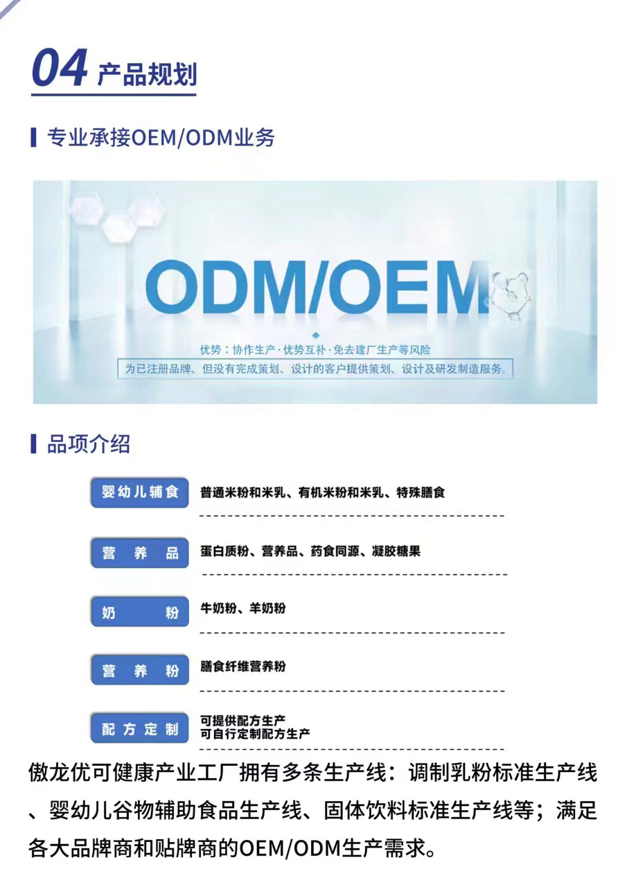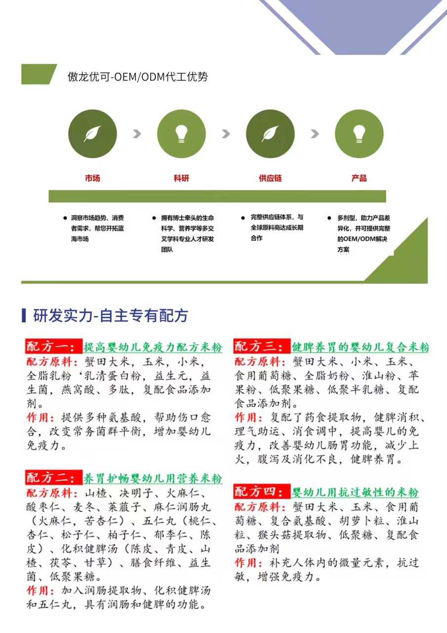 以“營養健康為專家”的理念為引領,江西傲龍優可健康產業主要以研發和生產嬰幼兒輔助食品、奶粉為根本,所生產的嬰幼兒輔助食品參照中國營養學會推薦的嬰幼兒營養需求量等營養科學技術標準,以當代嬰幼兒的生理特征及飲食習慣為研究方向,采用優質有機大米、全脂奶粉、低聚果糖、低聚半乳糖、多種維生素及礦物質研制出了獨有的健康營養輔食。
