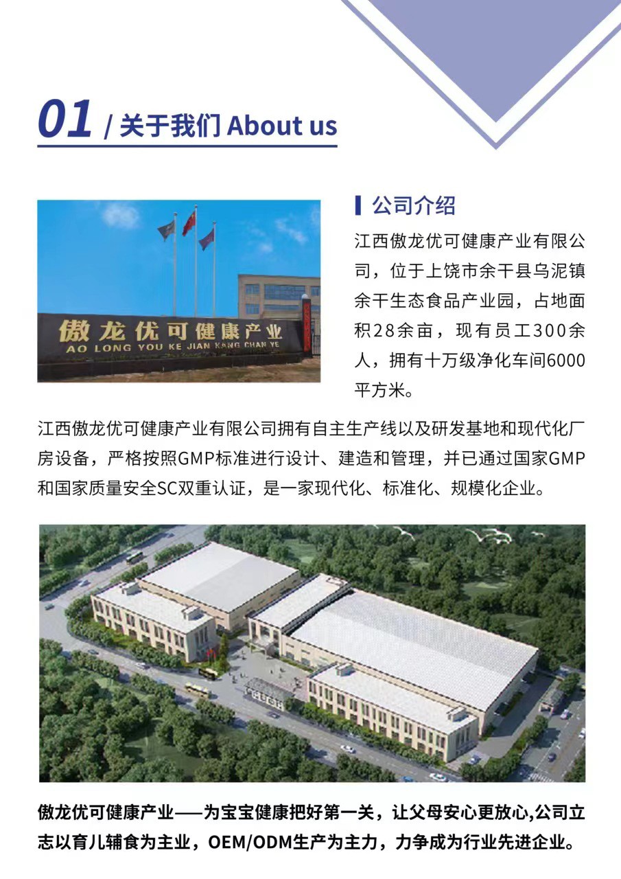江西傲龍優可健康產業有限公司,位于上饒市余干縣烏泥鎮余干生態食品產業園,占地面積28余畝,現有員工300余人,擁有十萬級凈化車間6000平方米,江西傲龍優可健康產業有限公司擁有自主生產線以及研發基地和現代化廠房設備,嚴格按照GMP標準進行設計、建造和管理,并已通過國家GMP和國家質量安全SC雙重認證,是一家現代化、標準化、規模化企業。