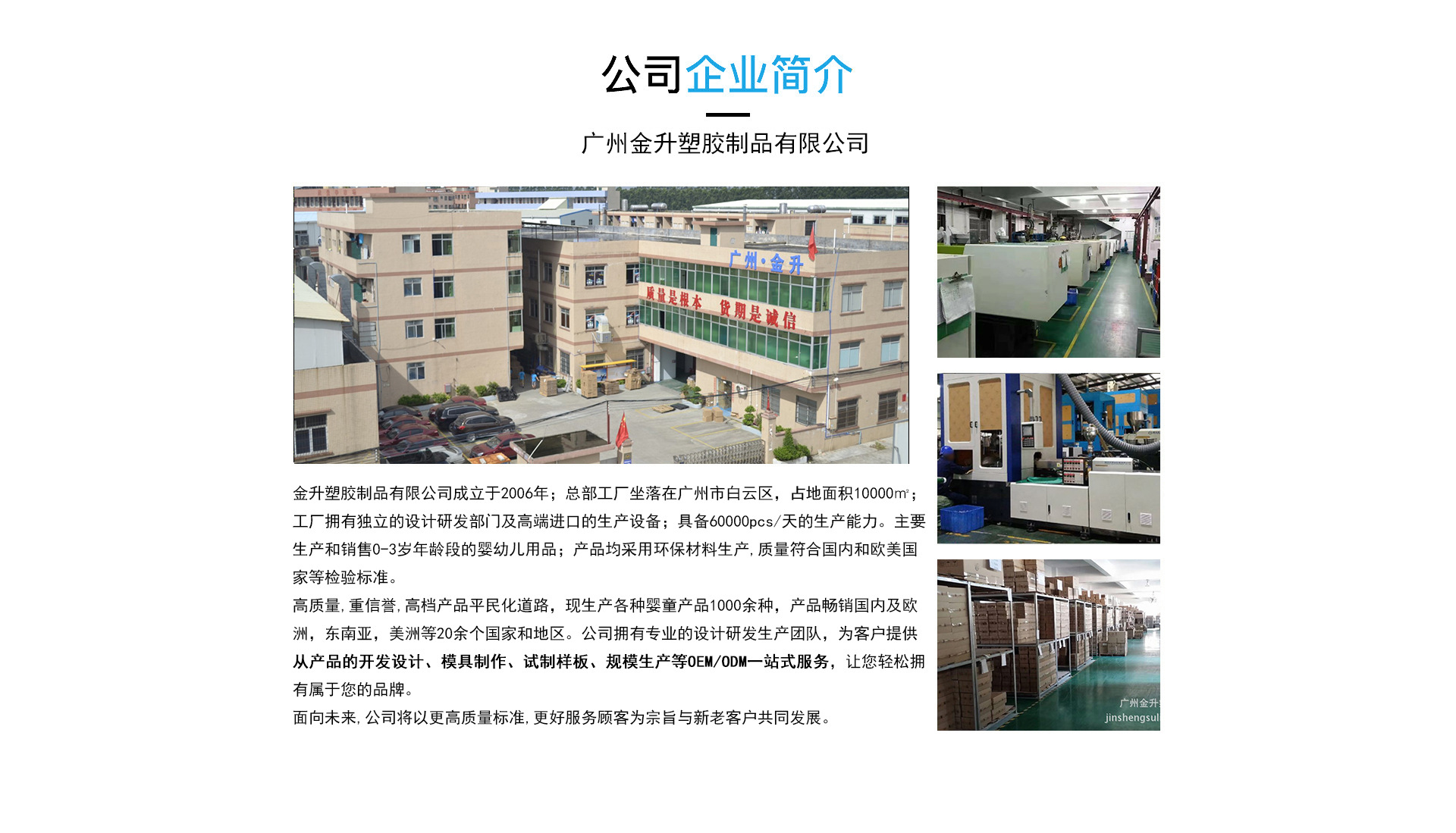 廣州金升塑膠制品有限公司 金升塑膠制品有限公司成立于2006年; 總部工廠坐落在廣州市白云區(qū)人和鎮(zhèn)東華工業(yè)區(qū)同貴路8號(hào)A2園區(qū),占地面積10000㎡; 工廠擁有行業(yè)內(nèi)領(lǐng)先的設(shè)計(jì)研發(fā)部門及一流的生產(chǎn)設(shè)備;具備60000pcs/天的生產(chǎn)能力。 主要生產(chǎn)和銷售0-3歲年齡段的嬰幼兒用品; 包括:嬰兒奶瓶系列、奶嘴系列、餐具系列、杯壺系列、健康護(hù)理清潔系列、母嬰安全生活用品系列等; 產(chǎn)品均采用環(huán)保材料生產(chǎn),質(zhì)量符合國(guó)內(nèi)和歐美國(guó)家等檢驗(yàn)標(biāo)準(zhǔn)。 高質(zhì)量,重信譽(yù),高檔產(chǎn)品平民化道路,現(xiàn)生產(chǎn)各種嬰童產(chǎn)品1000余種,產(chǎn)品暢銷國(guó)內(nèi)及歐洲,東南亞,美洲等20余個(gè)國(guó)家和地區(qū)。 公司擁有專業(yè)的設(shè)計(jì)研發(fā)生產(chǎn)團(tuán)隊(duì),為客戶提供從產(chǎn)品的開(kāi)發(fā)設(shè)計(jì)、模具制作、試制樣板、規(guī)模生產(chǎn)等OEM/ODM一站式服務(wù)。