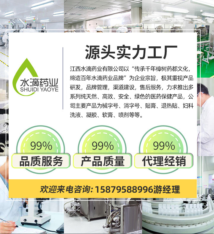 江西水滴藥業有限公司以“傳承千年樟樹藥都文化,締造百年水滴藥業品牌”為企業宗旨,極其重視產品研發,品牌管理,渠道建設,售后服務,力求推出多系列純天然、高效、安全、綠色的醫藥保健產品,公司主要產品為械字號、消字號、貼膏、退熱貼、婦科洗液、凝膠、軟膏、噴劑等等。