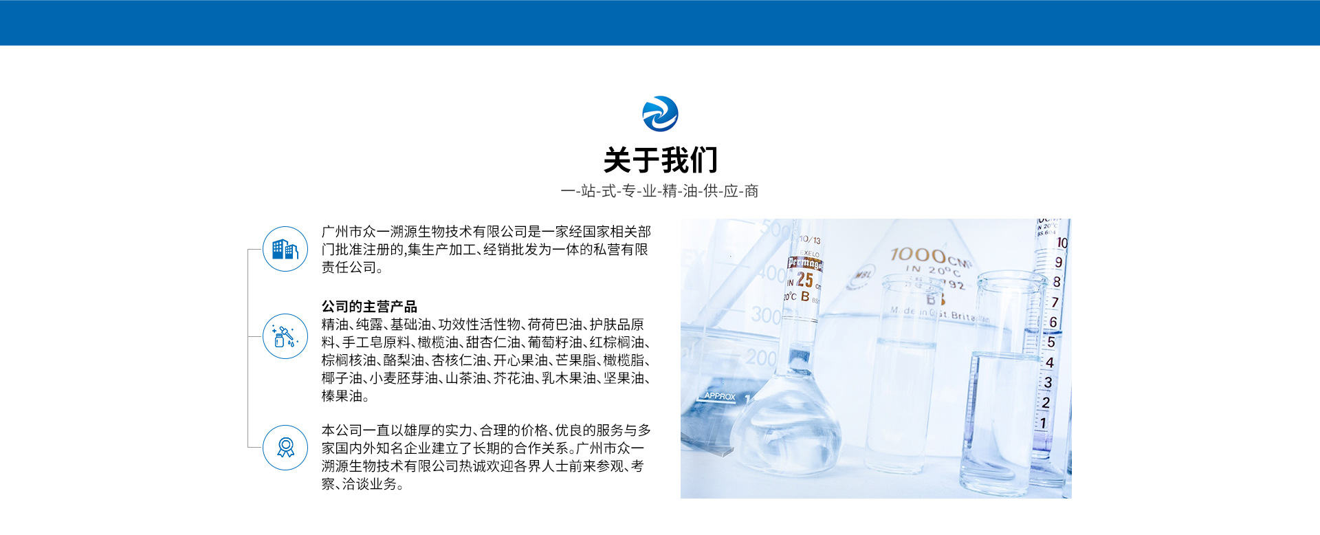 廣州市眾一溯源生物技術有限公司是一家集生產加工、經銷批發的私營有限責任公司。其中護膚品原料、手工皂原料、植物油脂、單方精油、功效性活性物、純露花水是廣州市眾一溯源生物技術有限公司的主營產品。植物油脂:有機荷荷巴油、初榨乳木果油、EV橄欖油、初榨鱷梨油、甜杏仁油、葡萄籽油、棕櫚油、玫瑰果油、芒果脂、橄欖脂、椰子油、小麥胚芽油、山茶油、芥花油、澳洲堅果油、榛果油等多達80個品種;單方精油:甜橙、薰衣草、玫瑰、迷迭香、葡萄柚、檸檬、茶樹、花梨木、大西洋雪松、檀香、乳香精油等多達60個品種。功效性活性物:VC、煙酰胺、透明質酸鈉、光甘草定、馨膚白377、水楊酸、甘油、日本味之素起泡劑、蘋果干細胞、蝦青素、富勒烯、二裂酵母、依克多因、神經酰胺3等多達200個品種。純露:玫瑰、洋甘菊、永久花、茶樹、橙花、馬迷、薰衣草、金縷梅、藍蓮花、積雪草、檀香、乳香純露等多達40個品種。