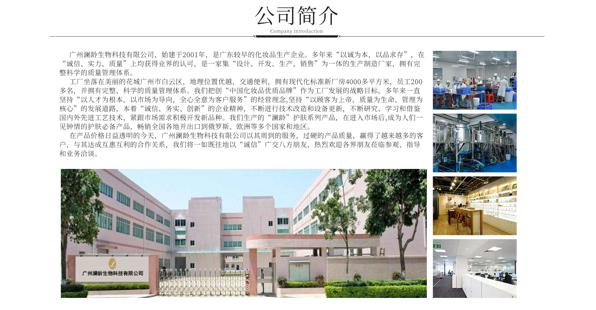 廣州瀾齡生物科技有限公司,始建于2001年,是廣東較早的化妝品生產企業。多年來“以誠為本,以品求存”,在“誠信、實力、質量”上均獲得業界的認可,是一家集“設計、開發、生產、銷售”為一體的生產制造廠家,擁有完整科學的質量管理體系。      工廠在廣州市白云區,擁有現代化標準新廠房5000多平方米,員工200多名,并擁有完整、科學的質量管理體系,多年來一直堅持“以人才為根本,以市場為導向,全心全意為客戶服務”的經營理念,堅持“以顧客為上帝、質量為生命、管理為核心”的發展道路,本著“誠信、務實、創新”的企業精神,不斷進行技術改造和設備更新,不斷研究、學習和借鑒國內外先進工藝技術,緊跟市場需求積極開發新品種。在產品價格日益透明的今天,廣州瀾齡生物科技有限公司以其周到的服務,過硬的產品質量,贏得了越來越多的客戶,我們以“誠信”廣交八方朋友,熱烈歡迎各界朋友蒞臨參觀。