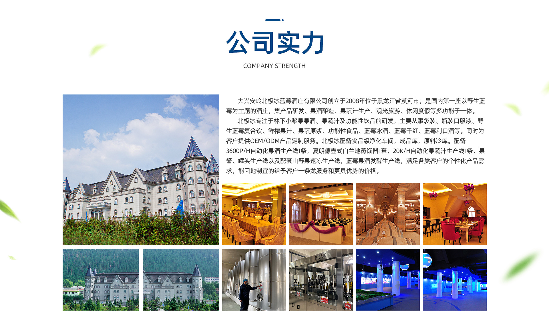 大興安嶺北極冰藍(lán)莓酒莊有限公司是由阿木爾林業(yè)局和伊春市鑫野實(shí)業(yè)有限公司共同創(chuàng)建的。是大力扶持資源枯竭型地區(qū)經(jīng)濟(jì)轉(zhuǎn)型項(xiàng)目的重點(diǎn)扶持企業(yè)。為配合在“中國(guó)野生藍(lán)莓之鄉(xiāng)”打造中國(guó)藍(lán)莓小鎮(zhèn),2008年北極冰先后斥資億元,興建北極冰藍(lán)莓酒莊。酒莊建筑風(fēng)格為歐式古典酒堡,是國(guó)內(nèi)第一座以野生藍(lán)莓為主題的酒莊,集產(chǎn)品研發(fā)、果酒釀造、果蔬汁生產(chǎn)、觀光旅游、休閑度假等多功能于一體。目前酒莊占地面積達(dá)22萬平方米,建筑面積1.8萬平方米。北極冰藍(lán)莓酒莊以野生藍(lán)莓資源為發(fā)展之本,自有野生藍(lán)莓基地6000畝。同時(shí)依托政府扶持,擁有中國(guó)野生藍(lán)莓1/4的采摘資源。累計(jì)野生藍(lán)莓采摘基地達(dá)22萬公頃。 北極冰藍(lán)莓酒莊秉承“發(fā)現(xiàn)藍(lán)莓價(jià)值,引領(lǐng)行業(yè)創(chuàng)新”的經(jīng)營(yíng)理念,專注林下小漿果果酒、果蔬汁及功能性飲品的研發(fā),同時(shí)為客戶提供OEM/ODM產(chǎn)品定制服務(wù)。北極冰配備食品級(jí)凈化車間,成品庫(kù),原料冷庫(kù)。配備3600P/h自動(dòng)化果酒生產(chǎn)線