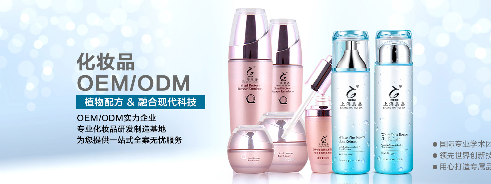 上海惠嘉化妝品有限公司成立于2010年。公司集研發、生產及銷售為一體,專業從事化妝品OEM/ODM/OBM加工業務。早在1999年,惠嘉即開始涉足精油產業,是精油早期進入大陸市場應用的首批企業之一。