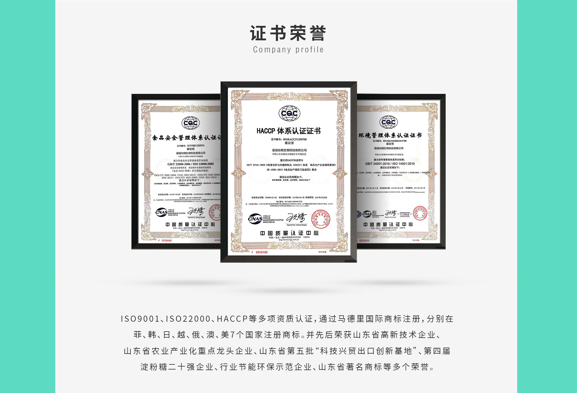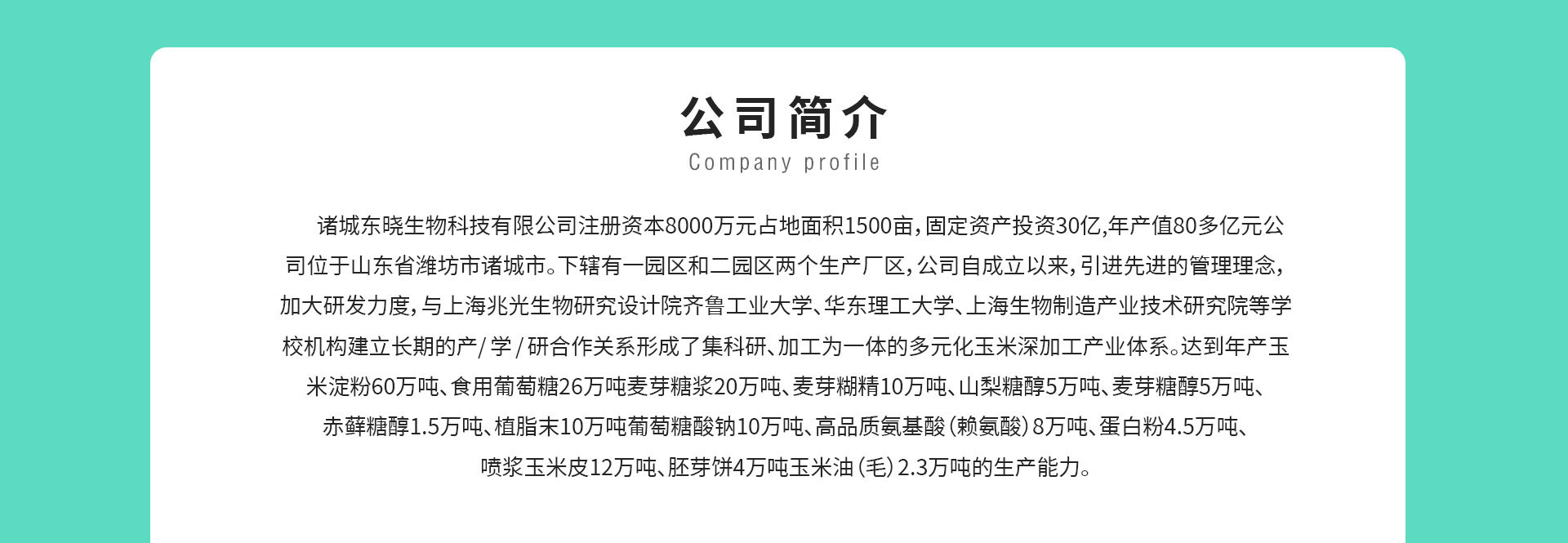 諸城東曉生物科技有限公司成立于2005年,專注淀粉糖行業15年,產品出口80多個國家。注冊資本8000萬元,占地面積800畝,總投資26億元,總產值50億元。現有職工3000人,其中研發人員320人。下轄東曉 一廠、東曉二廠兩個生產廠區、諸城源發生物科技有限公司、諸城曙光生物科技有限公司兩個控股公司。  公自成立以來,引進先進管理理念,加大研發力度,與上海兆光生物研究設計院、齊魯工業大學、華東理工大學上海生物制造產業技術研究院建立長期的產學研合作關系,形成了集科研、加工為一體的多元化玉米深加工產業體系。達到年產玉米淀粉60萬噸、食用葡萄糖26萬噸、麥芽糖漿20萬噸、麥芽糊精10萬噸、山梨糖醇5萬噸、麥芽糖醇5萬噸、赤蘚糖醇2萬噸、植脂末10萬噸、葡萄糖酸鈉10萬噸、高品質氨基酸(賴氨酸)8萬噸、蛋白粉4.5萬噸、噴漿玉米皮12萬噸、胚芽餅4萬噸、玉米油(毛)2.3萬噸的生產能力。