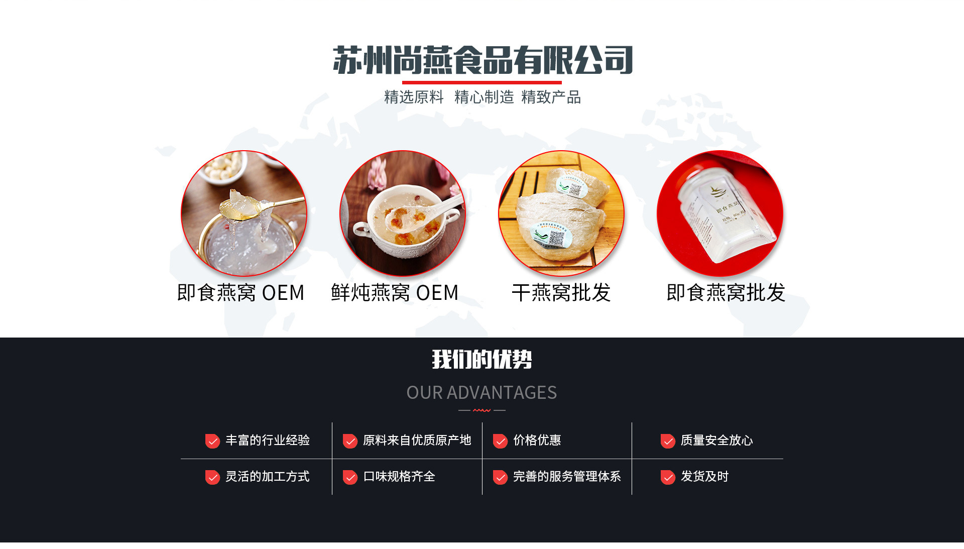 蘇州尚燕食品有限公司是即食燕窩、即食燕窩代加工、OEM貼牌生產、紙箱、玻璃瓶等產品專業生產加工的公司,擁有完整、科學的質量管理體系。蘇州尚燕食品有限公司的誠信、實力和產品質量獲得業界的認可。歡迎各界朋友蒞臨參觀、指導和業務洽談。