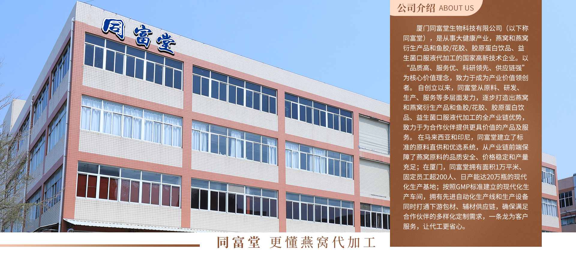 廈門同富堂生物生物科技有限公司專注于大健康產業,研發生產銷售一體,主要產品燕窩、果凍、果蔬果粉、益生菌、膠原蛋白飲品、壓片糖果、花椒定制生產。