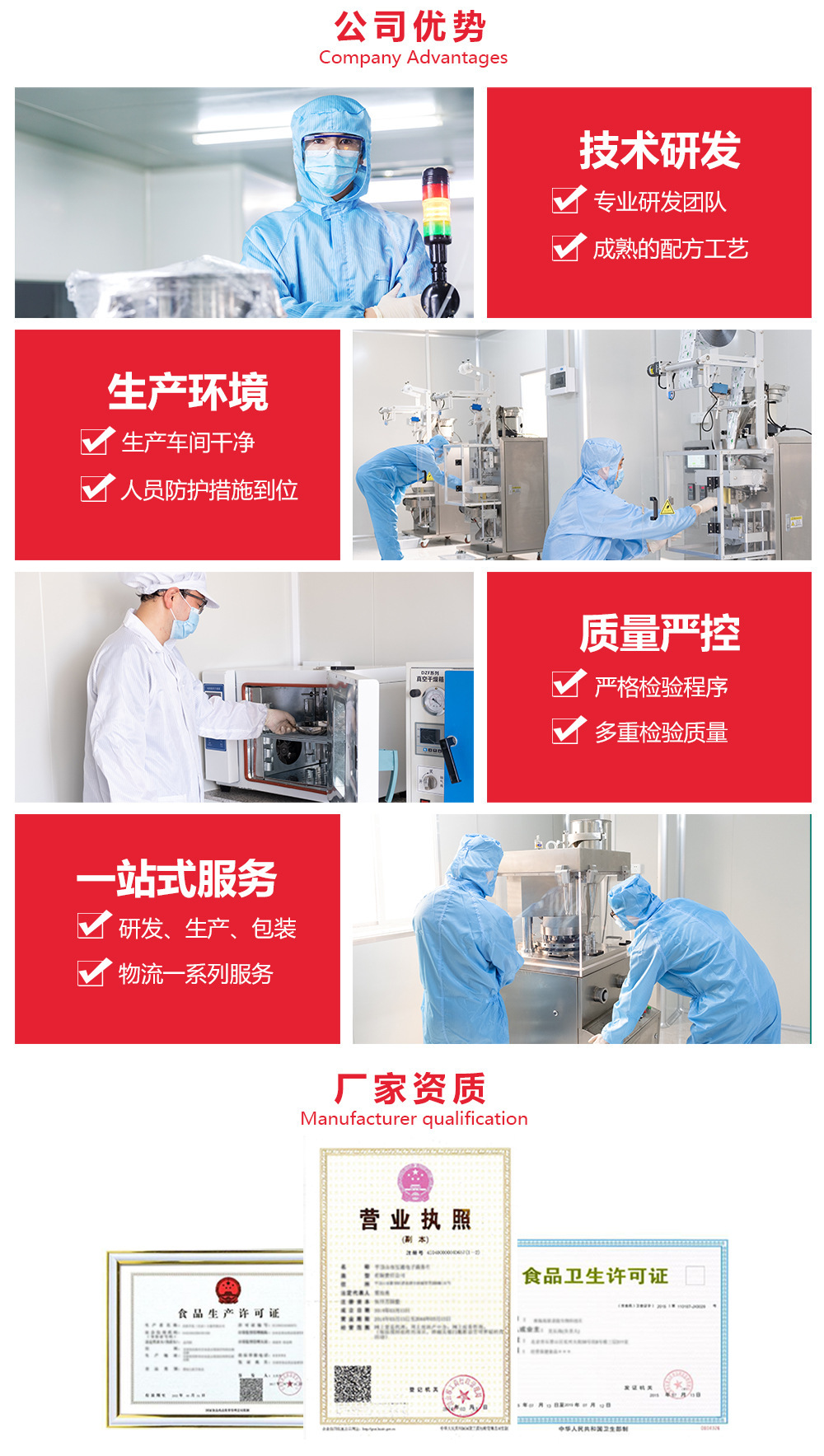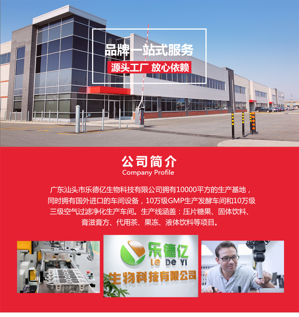 廣東省汕頭市樂德億生物科技有限公司擁有10000平的生產基地。擁有國外進口的車間設備,10萬級GMP生產發酵車間和10萬級三級空氣過濾凈化生產車間。擁生產線涵蓋:壓片糖果、固體飲料、膏滋膏方、代用茶、果凍、液體飲料、軟糖等項目。