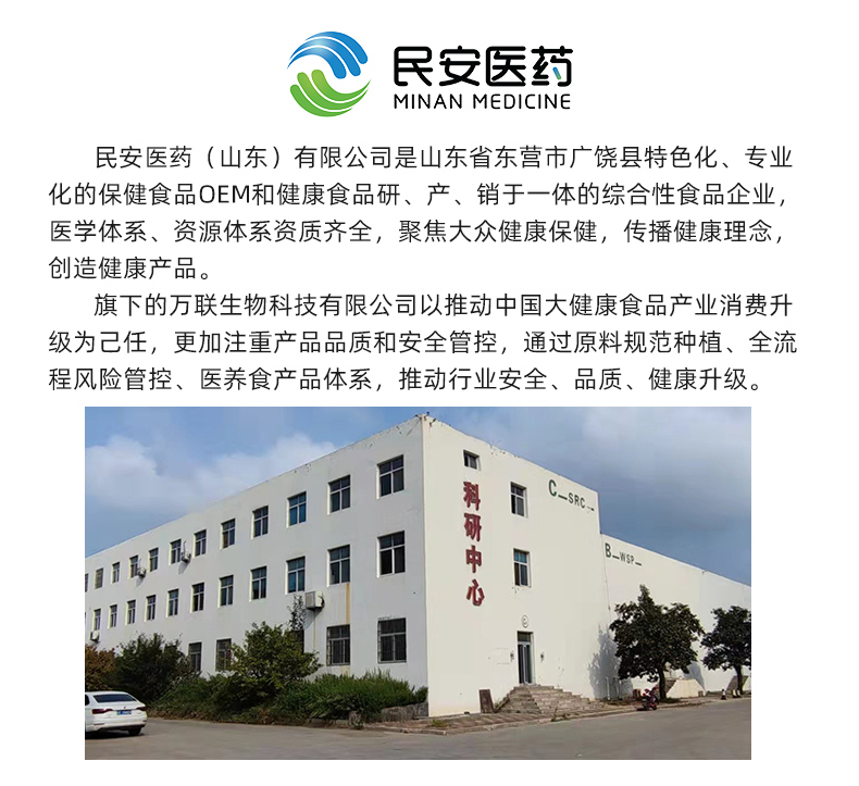 民安醫(yī)藥(山東)有限公司是山東省東營市廣饒縣特色化、專業(yè)化的保健食品OEM和健康食品研、產、銷于一體的綜合性食品企業(yè),醫(yī)學體系、資源體系資質齊全,聚焦大眾健康保健,傳播健康理念,創(chuàng)造健康產品。