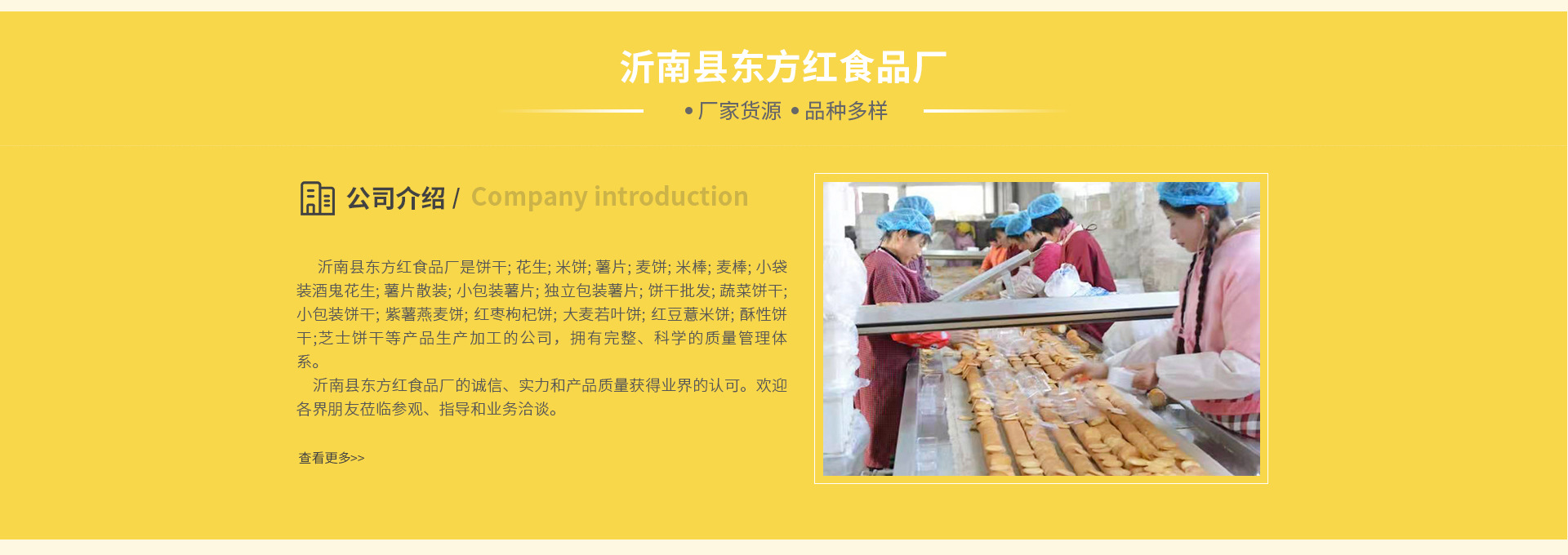 沂南縣東方紅食品廠是餅干、花生、米餅等產品生產加工的公司,擁有完整、科學的質量管理體系。沂南縣東方紅食品廠的誠信、實力和產品質量獲得業界的認可。歡迎各界朋友蒞臨參觀、指導和業務洽談。