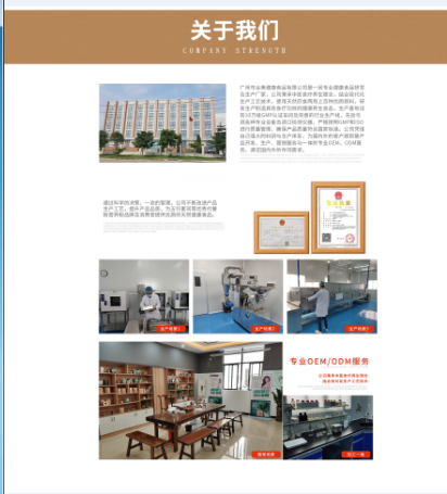 廣州市谷美健康食品有限公司秉承中醫食療養生理念,結合現代化生產工藝技術,使用天然藥食兩用上百種優質原料,研發生產制造具有食療功效的健康養生食品,生產基地設有10萬級凈化標準車間及完善的行業生產線,先后引進各種專業設備及進口檢測儀器,嚴格按照GMP和ISO進行質量管理,確保產品質量符合國家標準。公司憑借自己強大的科研與生產體系,為國內外的客戶提供集產品開發、生產、營銷服務與一體的專業OEM、ODM服務,滿足國內外的市場需求