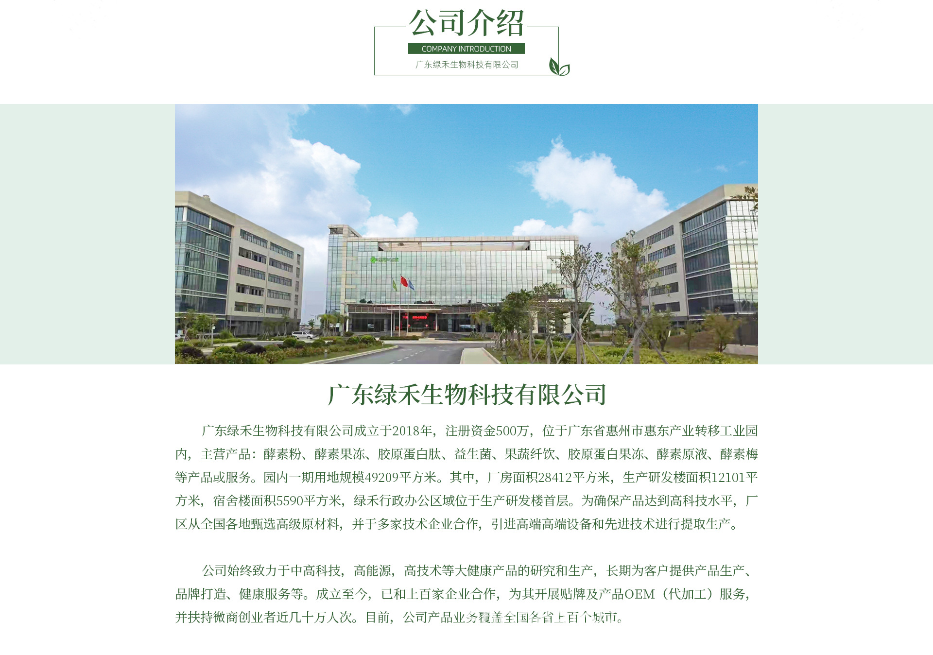 廣東綠禾生物科技有限公司成立于2018年,注冊資金500萬,位于廣東省惠州市惠東產業轉移工業園內,主營產品:酵素粉,酵素果凍,膠原蛋白肽,益生菌,果蔬纖飲,膠原蛋白果凍,酵素原液,酵素梅等產品或服務。 公司經營范圍:生產、銷售、研發:食品、電子產品、新能源產品、化妝品、醫療器械;生物技術的咨詢與研發,實業投資,貨物或技術進出口