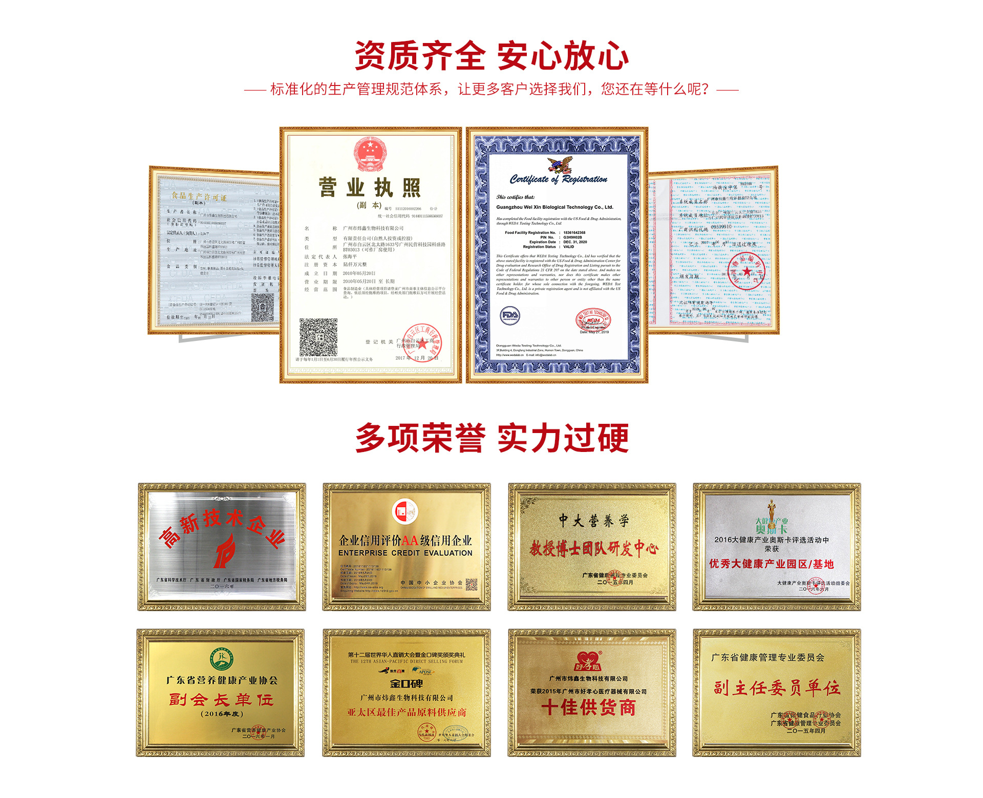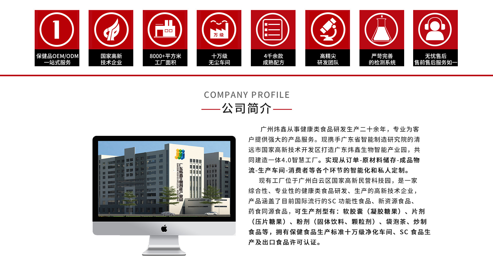 廣州市煒鑫生物科技有限公司,是營養保健食品領域一家以技術創新及國際化為戰略導向,集研發、生產、銷售、技術服務為一體的綜合服務提供商。公司在營養保健食品領域深耕多年,一直保持對市場需求和技術發展的關注,持續開展營養、功能配方的開發和劑型技術的應用研究,以更好地滿足從嬰童、青少年、孕婦到中老年人群的不同健康需求。公司自建前沿營養研究院,擁有2位英國皇家院士、10余位博士、及研發應用工程師組成的行業專家團隊,為客戶提供卓越的產品