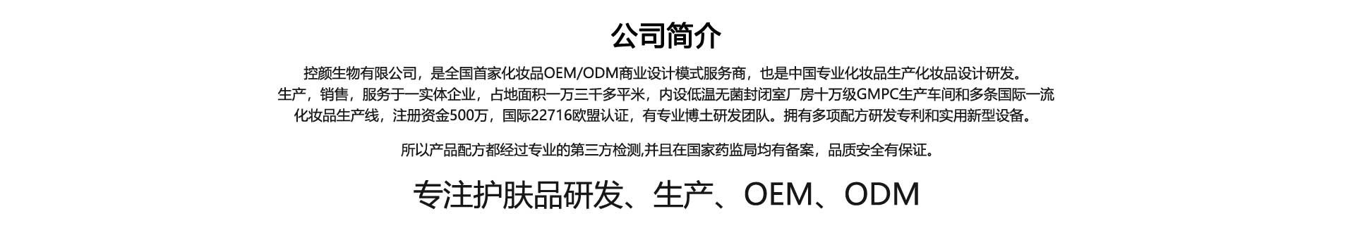 廣州控顏生物科技有限公司是一家專業從事高端化妝品研發、生產、銷售、服務、及功效性原料供應于一體的OEM、ODM(代加工)綜合性企業。擁有八千平方標準廠房,10萬級生產車間及歐盟認證實力資質,本公司以“產品質量——安全 ? 有效;協同合作——雙向 ? 共贏”為經營理念,著力打造以客戶為根本,以質量為命脈,讓顧客放心的自主品牌加工基地。以雄厚的技術力量作后盾,不斷的研發各種天然、獨特、安全、高效的高品質產品,根據市場及顧客的需求進行靈活性的配方設計,幫您生產個性化產品,助您創造自己的品牌。我們的產品范圍:護膚系列、補水保濕類、祛斑美白類、 消炎祛痘類、 祛皺保濕類 、豐胸美乳類、 瘦身減肥類、 紅血絲修復類、 妊娠紋修復類、 眼部三癥類、 抗敏修復類等