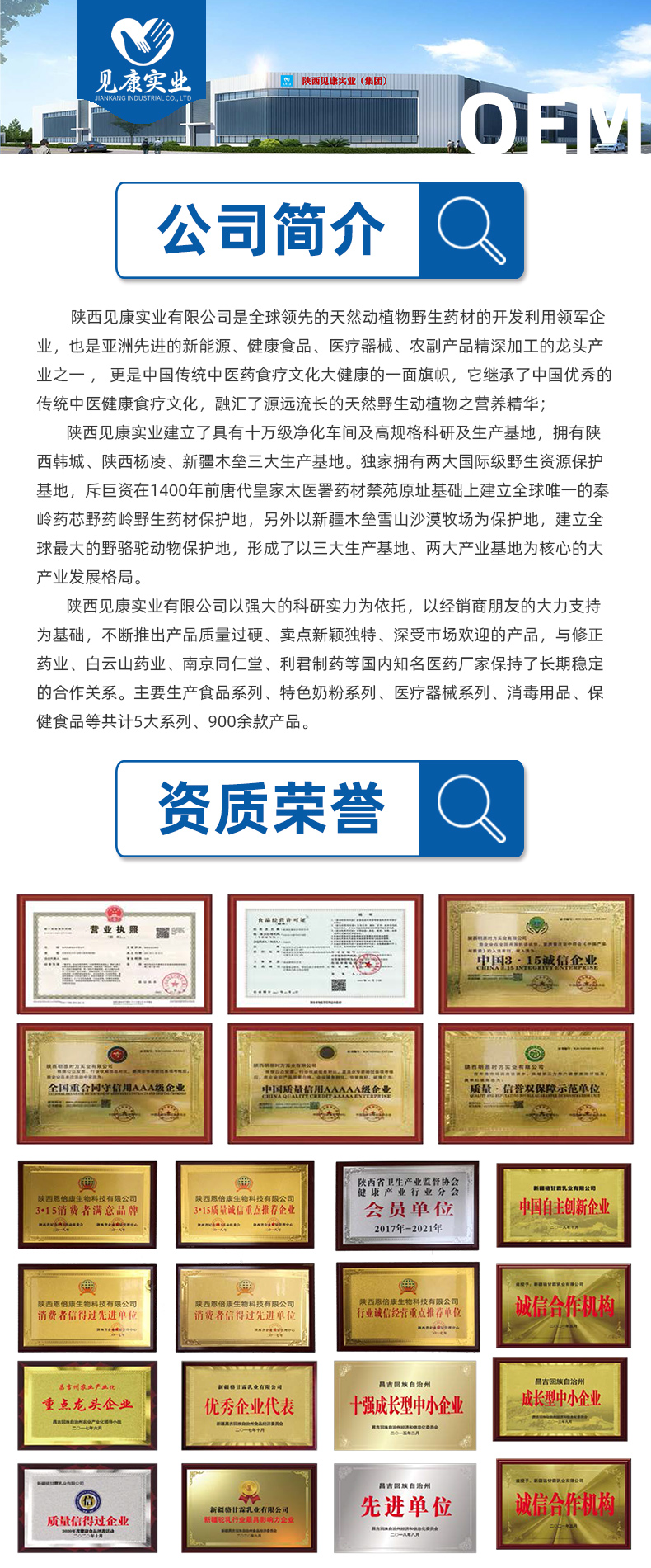 本著高起點、高質量、高發展的經營思路,陜西見康實業建立了具有十萬級凈化車間及高規格科研及生產基地,擁有陜西韓城、陜西楊凌、新疆木壘三大生產基地。同時獨家擁有兩大國際級野生資源保護基地,斥巨資在1400年前唐代皇家太醫署藥材禁苑原址基礎上建立全球唯一的秦嶺藥芯野藥嶺野生藥材保護地,另外以新疆木壘雪山沙漠牧場為保護地,建立全球最大的野外駱駝營養動物保護地,形成了以三大生產基地、兩大產業基地為核心的大產業發展格局。