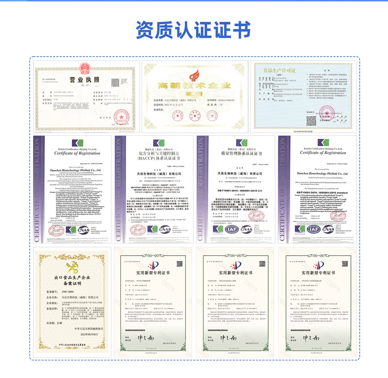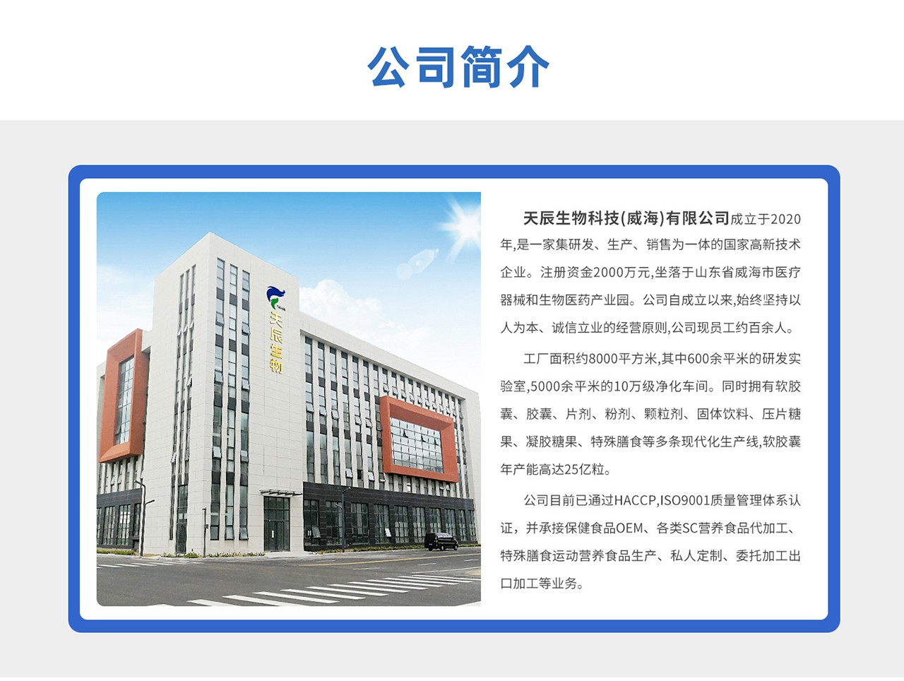 天辰生物科技(威海)有限公司,成立于2020年,是一家集研發(fā)、設(shè)計(jì)、生產(chǎn)、銷售為一體的高新技術(shù)企業(yè)。 注冊(cè)資金2000萬(wàn)元,坐落于山東省威海市醫(yī)療器械產(chǎn)業(yè)園。公司自成立以來,始終堅(jiān)持以人才為本、誠(chéng)信立業(yè)的經(jīng)營(yíng)原則,公司現(xiàn)員工約60余人。工廠面積約8000多平方米,其中600余平米的研發(fā)實(shí)驗(yàn)室,5000余平米的10萬(wàn)級(jí)凈化車間。同時(shí)擁有軟膠囊、膠囊、片劑、粉劑、固體飲料、壓片糖果、凝膠糖果、特殊膳食食品等多條現(xiàn)代化生產(chǎn)線,軟膠囊年產(chǎn)能高達(dá)25億粒。公司目前已通過榮獲HACCP,ISO9001出口資質(zhì)認(rèn)證,并承接各類特殊膳食食品、 SC營(yíng)養(yǎng)食品代加工、私人定制、保健食品OEM、委托加工、出口加工等業(yè)務(wù)。