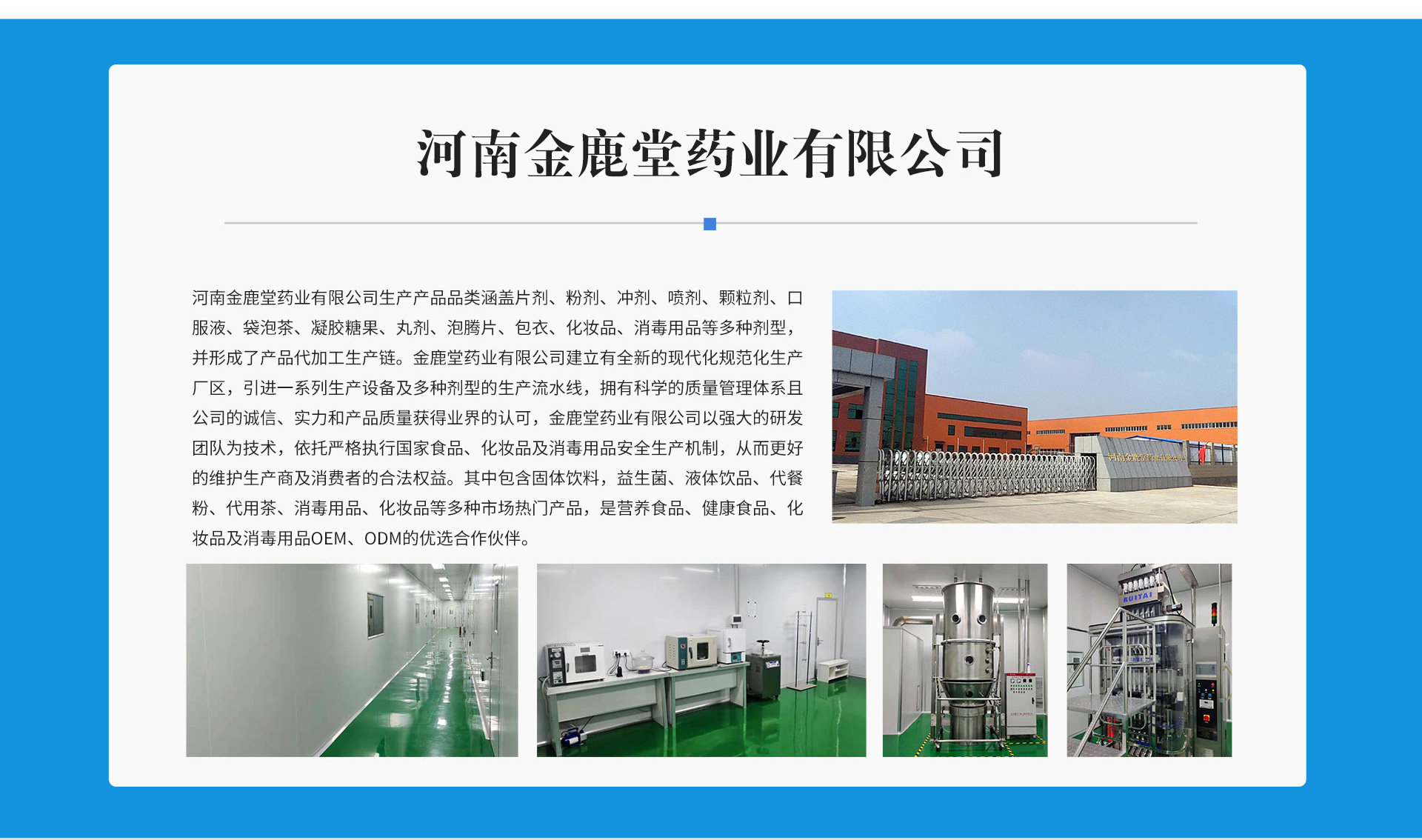 金鹿堂藥業有限公司生產產品品類涵蓋片劑、粉劑、沖劑、噴劑、顆粒劑、口服液、袋泡茶、凝膠糖果、丸劑、泡騰片、包衣、化妝品、消毒用品等多種劑型,并形成了產品代加工生產鏈。金鹿堂藥業有限公司建立有全新的現代化規范化生產廠區,引進一系列生產設備及多種劑型的生產流水線,擁有科學的質量管理體系且公司的誠信、實力和產品質量獲得業界的認可,金鹿堂藥業有限公司以強大的研發團隊為技術,依托嚴格執行國家食品、化妝品及消毒用品安全生產機制,從而更好的維護生產商及消費者的合法權益。其中包含固體飲料,益生菌、液體飲品、代餐粉、代用茶、消毒用品、化妝品等多種市場熱門產品,是營養食品、健康食品、化妝品及消毒用品OEM、ODM的優選合作伙伴。 金鹿堂藥業有限公司,秉承關愛生命、以人為本的經營理念、科技創新、追求卓越的企業宗旨,以OEM生產、銷售及全程健康服務為一體打造健康的“金鹿堂”產品。